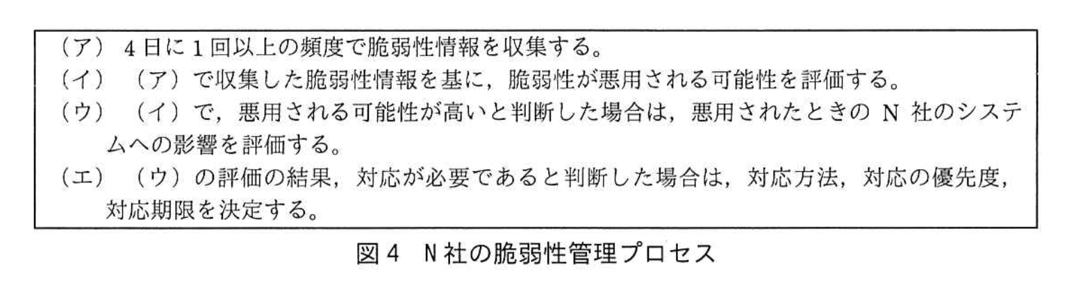 インシデントPと比較してインシデントQの対応は迅速に行われ、N-CSIRTのインシデント対応は有効であると、N社の経営陣からもB社からも一定の評価を得た。一方、インシデントQでR1サーバが不正にログインされたことを考えると、⑩図4(イ)及び(ウ)において、悪用される可能性の評価についての観点の不足、又は影響の評価についての観点の不足があり、悪用される可能性又は影響を過小評価したのではないかという指摘があった。そのため、脆弱性管理プロセスを見直すことにした。