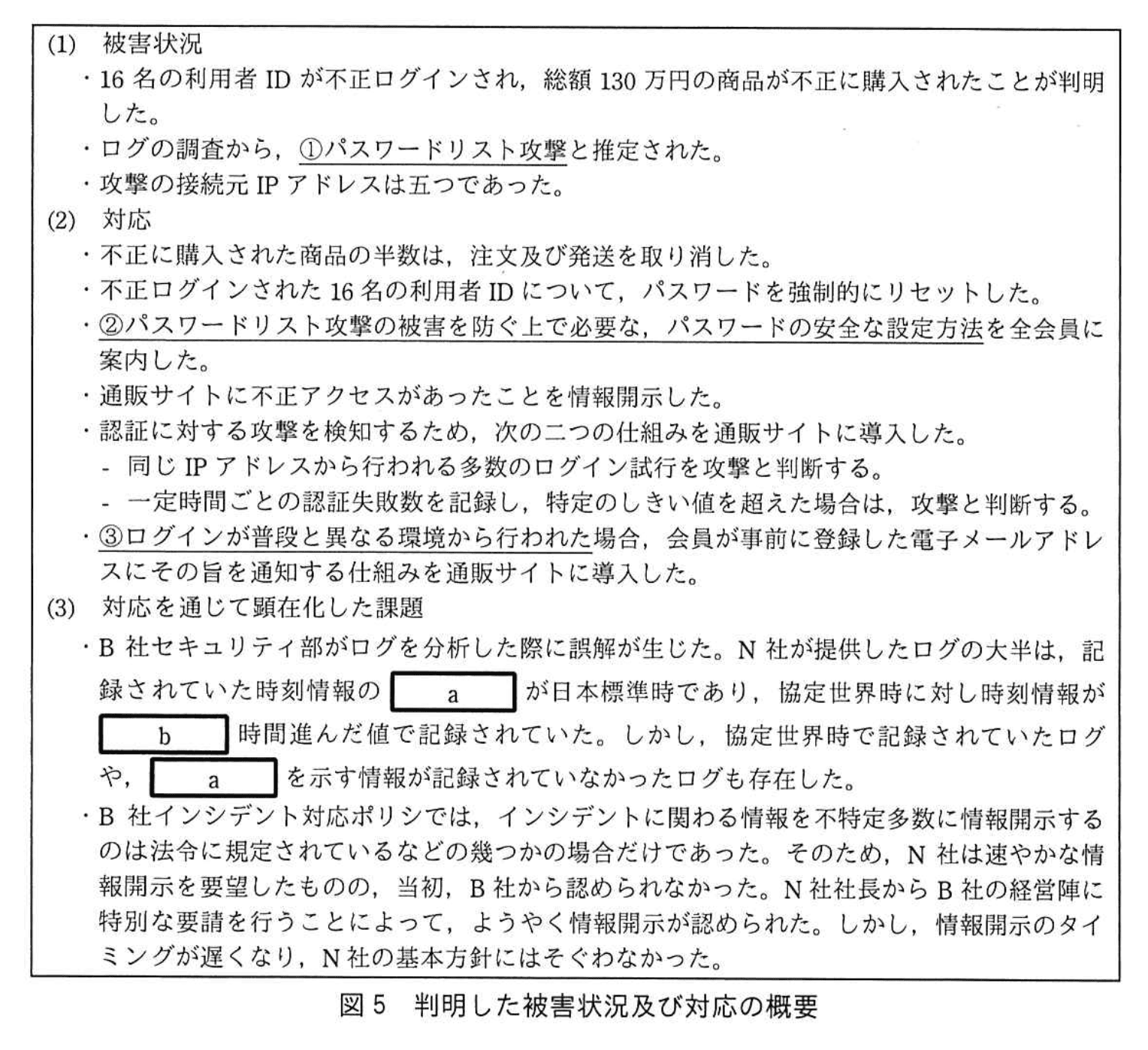 図5には「・ログの調査から、①パスワードリスト攻撃と推定された。」とあります。ここで問われているのは「パスワードリスト攻撃とは何か」です。 - 攻撃手法の特徴整理
