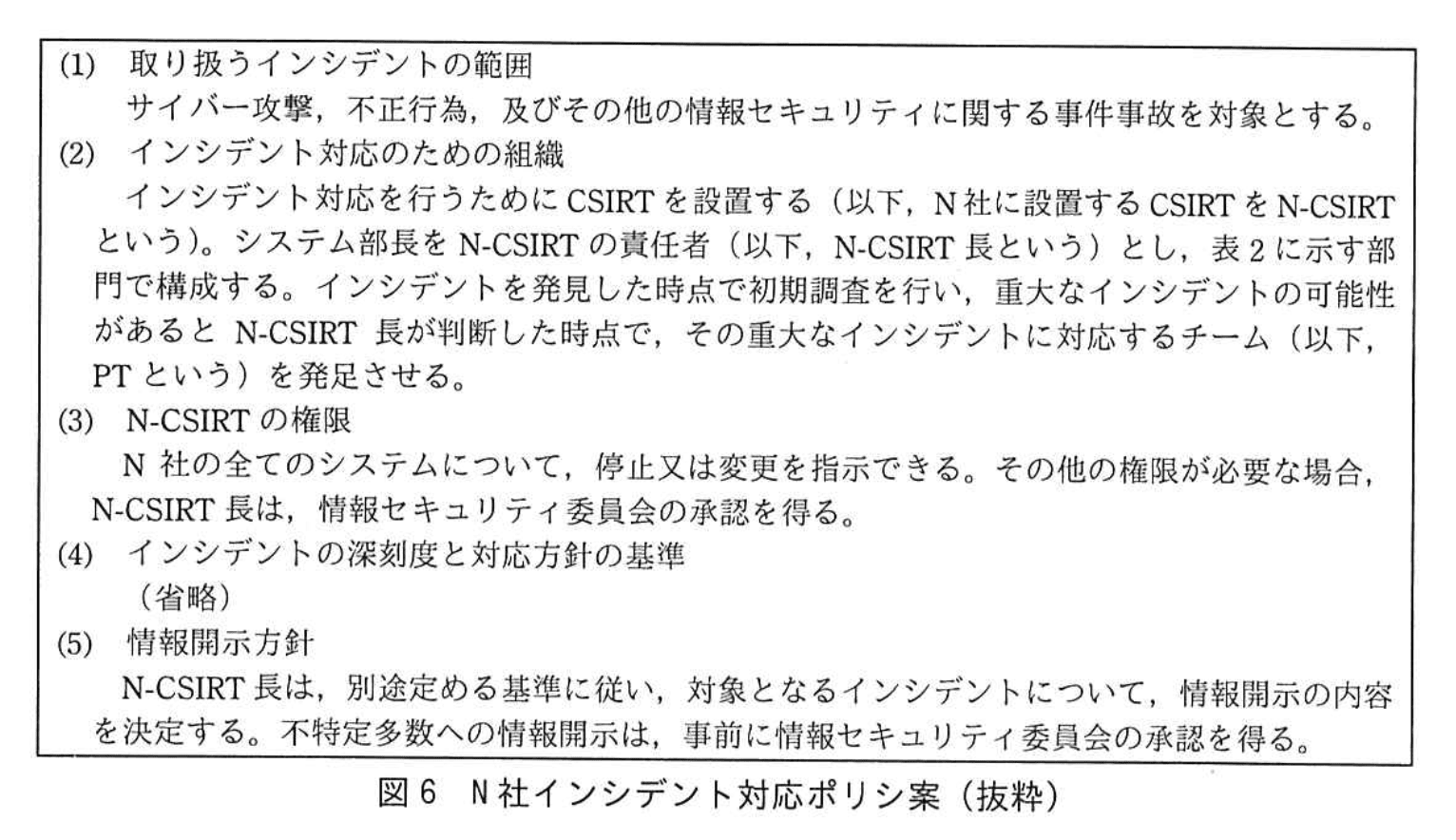条件2と条件3に対応すべく、Hさんは、図6に示すN社インシデント対応ポリシ案を作成し、T氏のレビューを受けた。