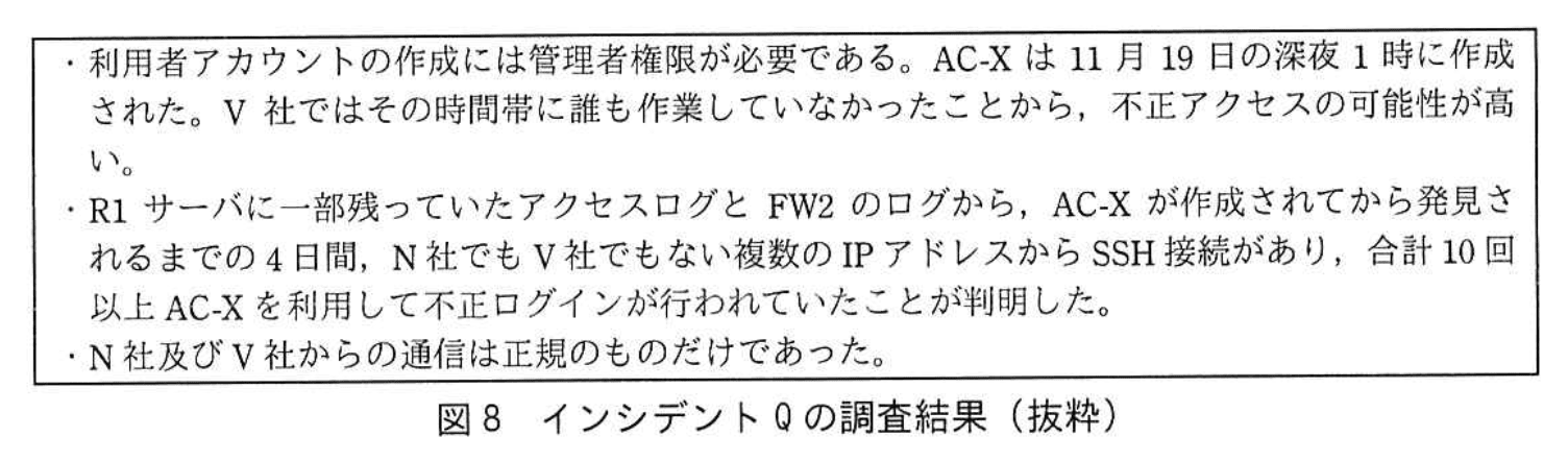 N社インシデント対応ポリシの運用を開始してから約1か月後の11月22日、V社は、不審な利用者アカウント(以下、AC-Xという)がR1サーバに作成されていることを見付け、N-CSIRTに報告した。G部長は、インシデントであると判断し、初期調査をHさんに指示した(以下、このインシデントをインシデントQという)。Hさんは、V社と協力してインシデントQについて調査した。その結果を図8に示す。