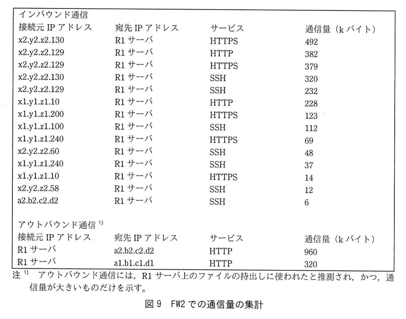 図9は、FW2において、AC-Xが作成されてから発見されるまでの4日間、通信に成功した全てのパケットを対象とし、通信方向、接続元及び宛先のIPアドレス、サービスの組合せで通信量を集計し、降順に並べたものである。Hさんは、⑤図9を基に、不正ログインを行ったと推測される接続元IPアドレスを割り出した。