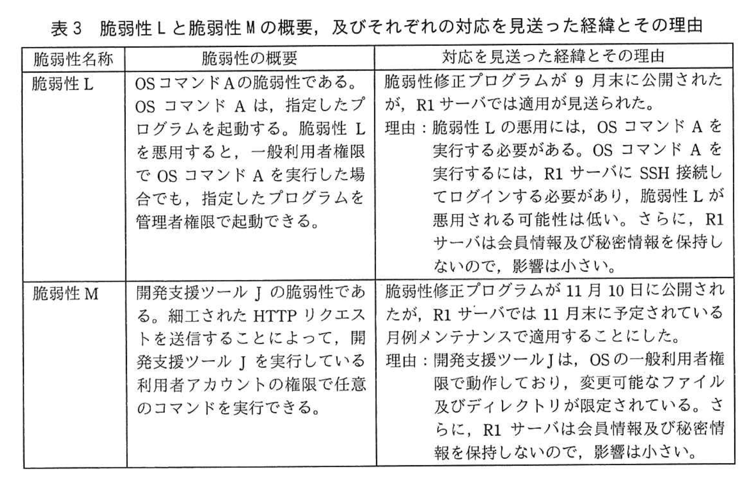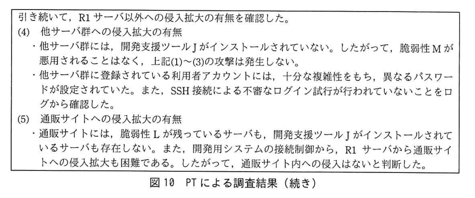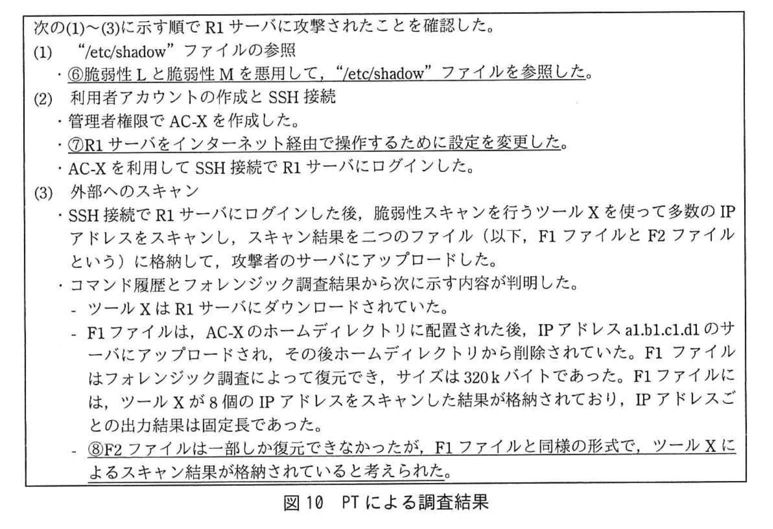Hさんから調査結果について報告を受けたG部長は、R1サーバの隔離を指示した上で、インシデントQは重大なインシデントの可能性があると判断し、PTを発足させた。PTは専門事業者の支援を受けて調査を行い、R1サーバには、脆弱性L及び脆弱性Mが残っていることが判明した。脆弱性Lと脆弱性Mの概要、及びそれぞれの対応を見送った経緯とその理由を表3に、PTによる調査結果を図10に示す。