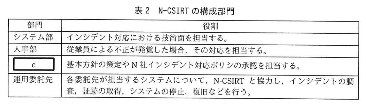 N社は、情報セキュリティ委員会を設置している。同委員会は、経営陣が委員となり、情報セキュリティについての基本方針(以下、基本方針という)及び重要な課題を取り扱う。セキュリティ対策は主にシステム部が担っており、セキュリティインシデント(以下、インシデントという)が発生した場合は、対応チームを立ち上げて対応する。基本方針では、消費者に影響を与えるインシデントの場合、社外に向けて速やかに情報開示することを挙げている。
