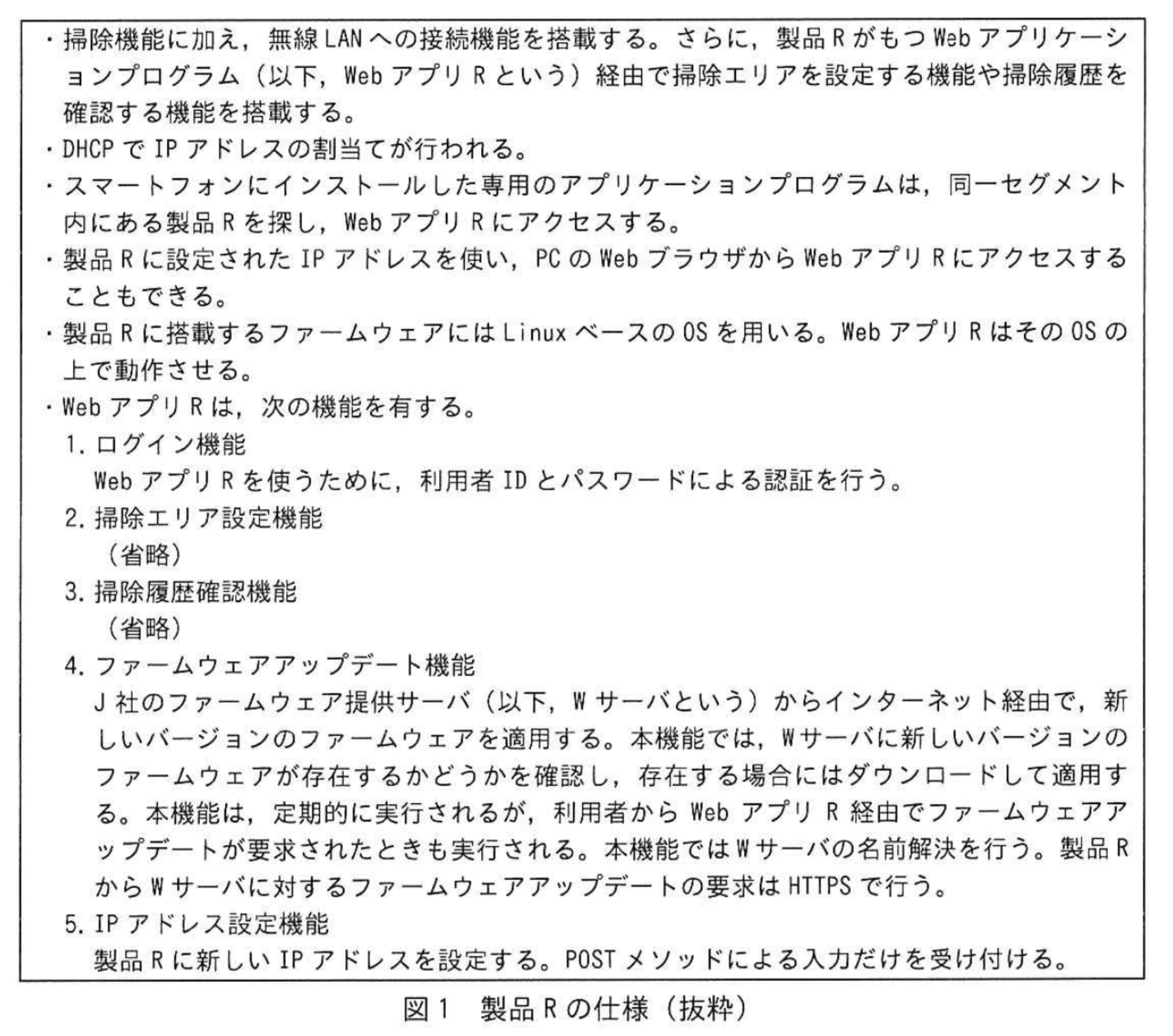 J社は、家電の製造・販売を手掛ける従業員1,000名の会社である。J社では、自社の売れ筋製品であるロボット掃除機の新製品(以下、製品という)を開発し、販売することにした。製品Rの仕様を図1に示す。