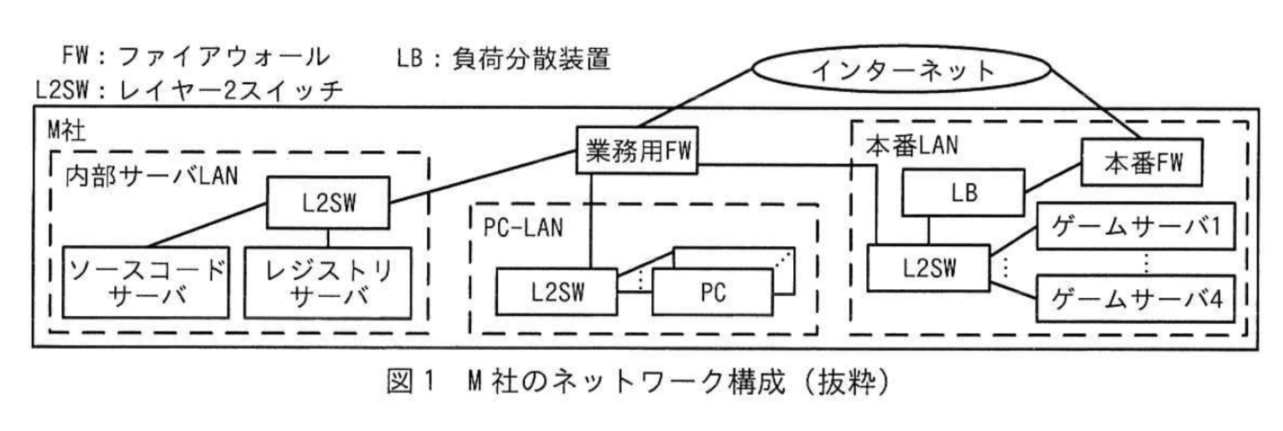 - 「Hさんが同日の業務用FWのログを確認したところ、ゲームサーバ1はインターネット上のIPアドレスa3,b3,c3,d3及びレジストリサーバに対してだけ接続していた。」