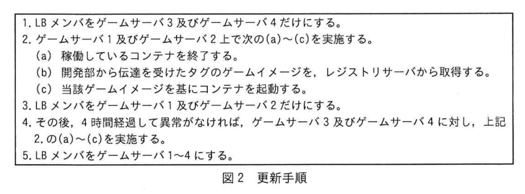 M社では、定期的にゲームアプリを更新する。開発部は新たなバージョンのゲームアプリに対して品質テストを行い、品質テストが完了したゲームイメージのタグを運用部に伝達する。運用部は図2に示す更新手順でゲームアプリを更新する。