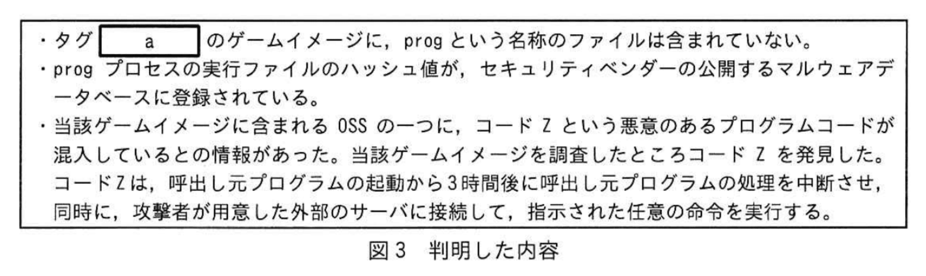 - Hさんの疑問「progという名称のファイルはタグaのゲームイメージに含まれていないのに、どうしてprogというプロセスが実行中だったのでしょうか。」に対し、K主任は下線①で「攻撃者がコードZに指示した命令が原因」と回答しました。