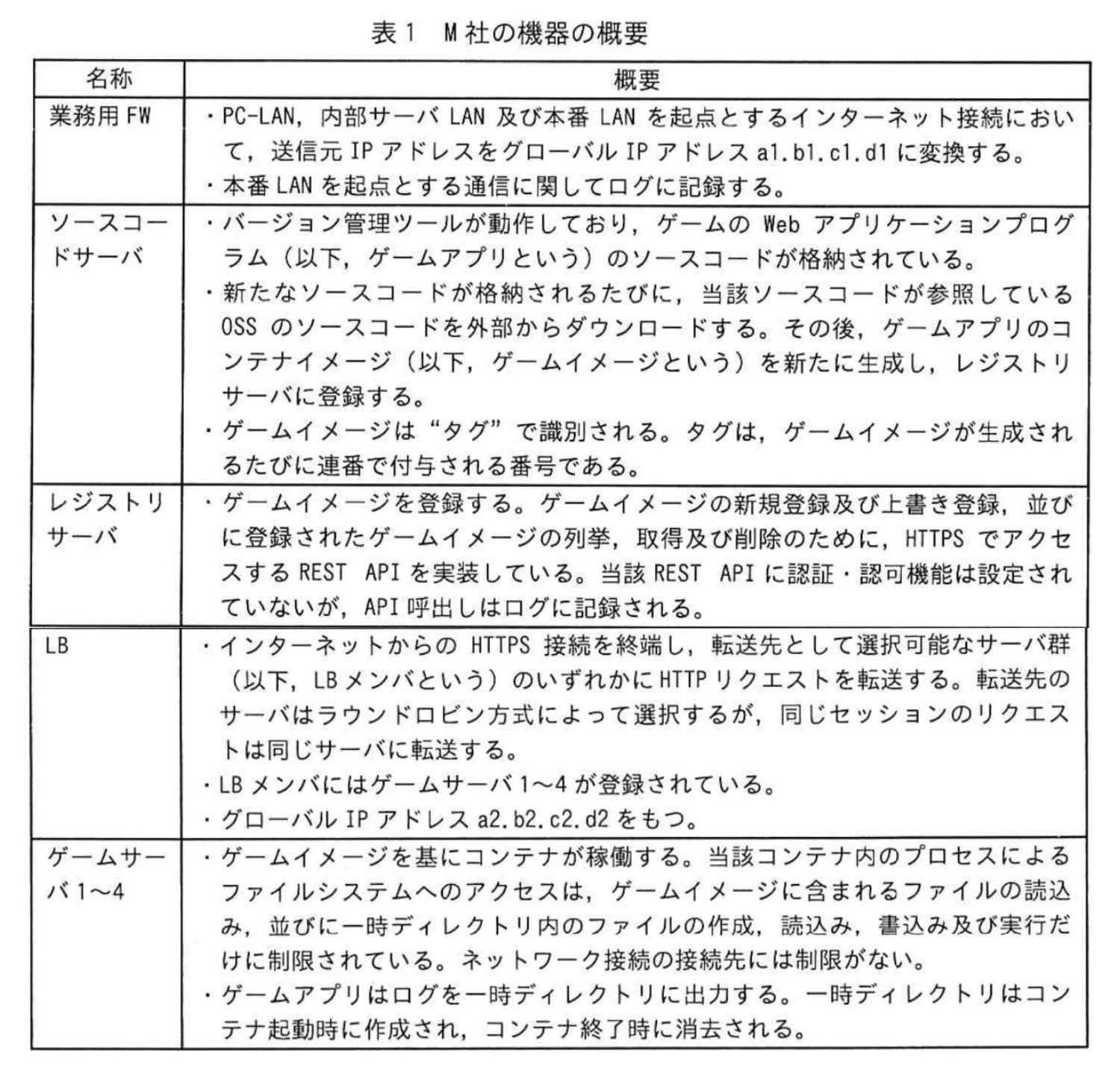 M社は従業員100名のオンラインゲーム事業者である。M社のゲームは利用者がWebブラウザからインターネット経由でアクセスして利用する。M社には開発部及び運用部があり、各従業員にはPCが貸与されている。M社の各PC及び各サーバには、固定のIPアドレスが割り当てられており、コンテナエンジンがインストールされている。