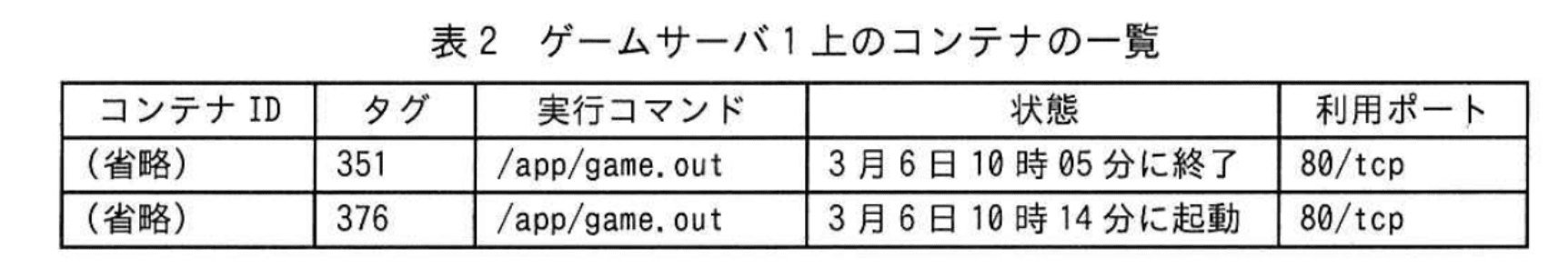 運用部のHさんは、3月6日に開発部からタグ367を伝達され、同日10時に更新手順を開始し、3.までを終えた。同日13時40分、Hさんは、ゲームサーバ1が応答していないことに気付き、LBメンバをゲームサーバ3及びゲームサーバ4だけにした後、ゲームサーバ1上のコンテナを確認した。Hさんが確認したコンテナの一覧を表2に示す。