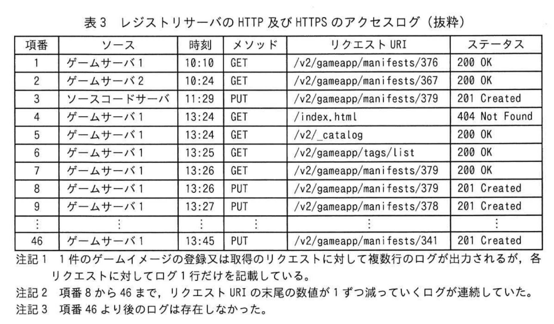 Hさんが同日の業務用FWのログを確認したところ、ゲームサーバ1はインターネット上のIPアドレスa3.b3.c3.d3及びレジストリサーバに対してだけ接続していた。そこでHさんは、同日のレジストリサーバのHTTP及びHTTPSのアクセスログを確認した。Hさんが確認したアクセスログを、表3に示す。