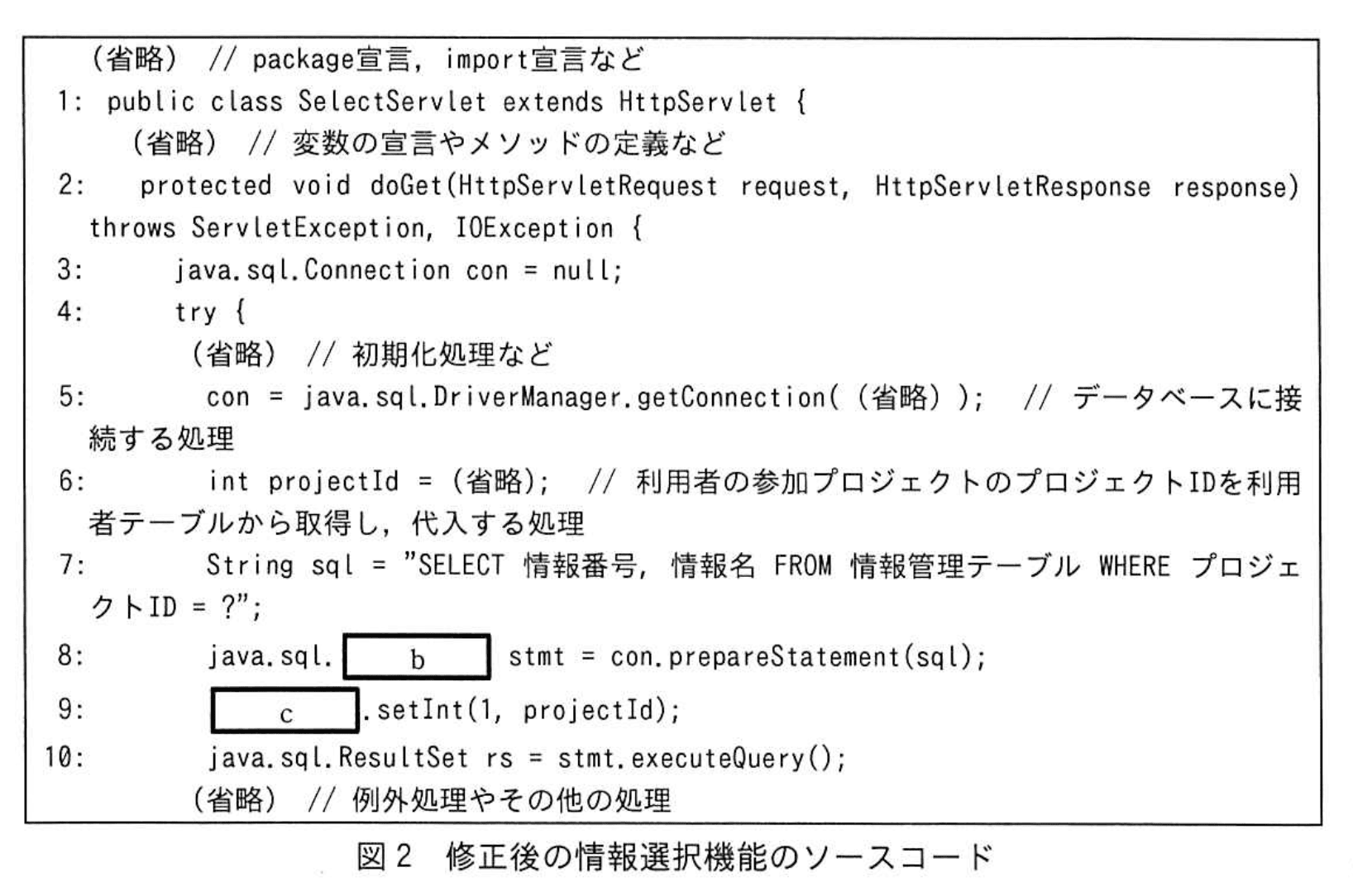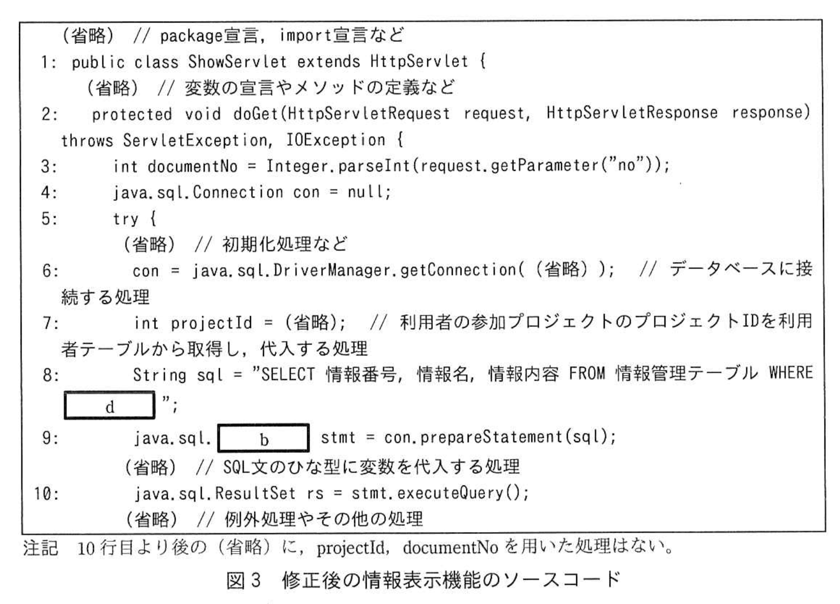 情報セキュリティ部は、情報表示機能にも情報選択機能と同様の脆弱性があることを指摘した。Dさんは、情報表示機能にも同様の修正を行った。修正後の情報表示機能のソースコードを図3に示す。