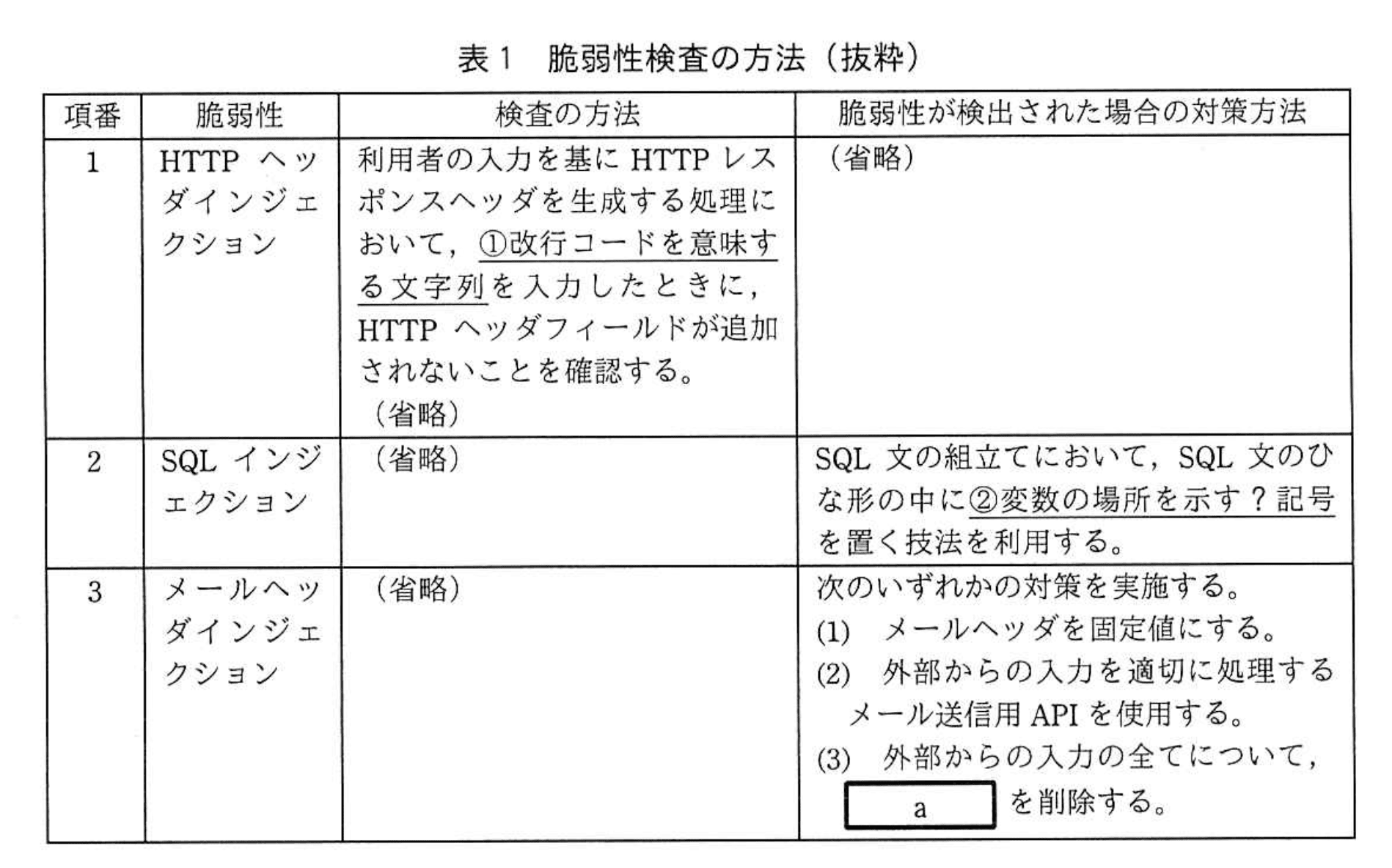 表1の「SQL インジェクション」対策には、 “SQL 文の組立てにおいて、SQL 文のひな形の中に②変数の場所を示す?記号を置く技法を利用する。”
