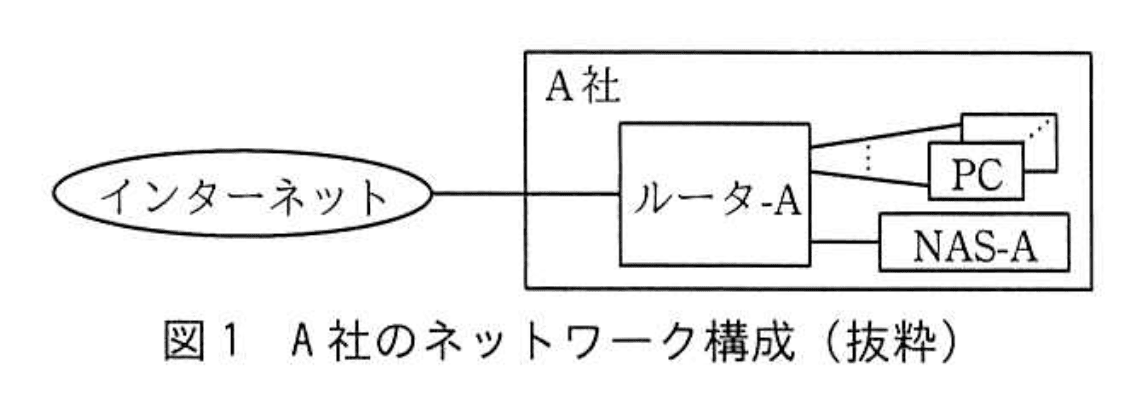 A社のネットワーク構成を図1に、NAS-Aの設定内容を表1に、ルータ-Aの設定内容を表2に示す。