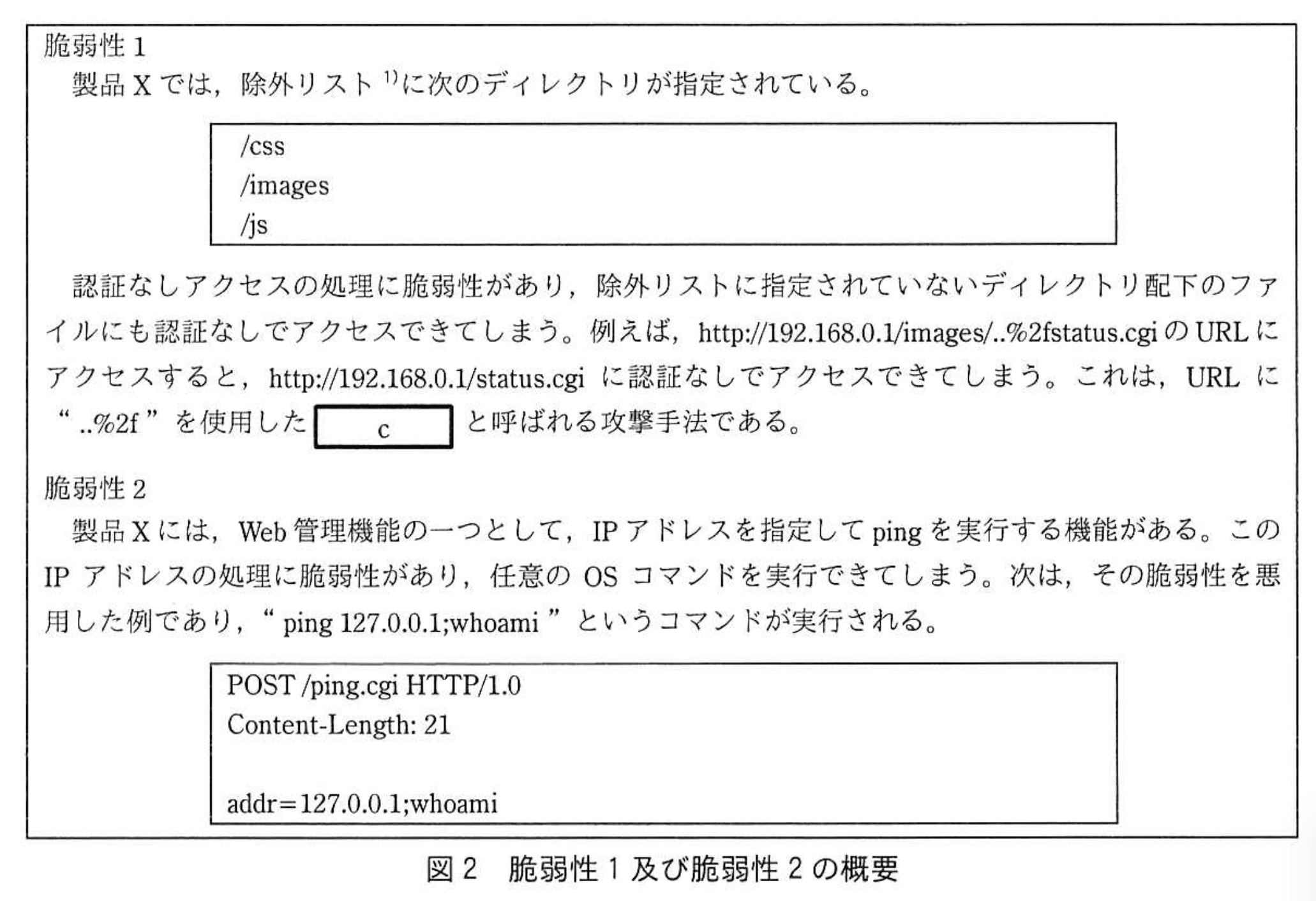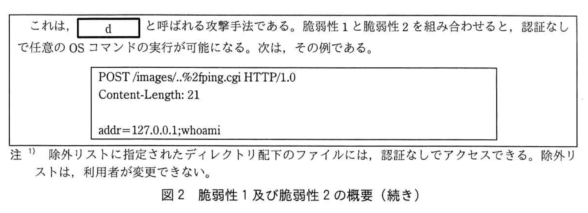 A: 図2は確かに「..%2f」を利用するパストラバーサルを示していますが、設問は「これは、dと呼ばれる攻撃手法」と述べた後に「任意のOSコマンドの実行が可能」と続いているため、最終的に焦点が当たっているのは OS コマンド実行の部分です。