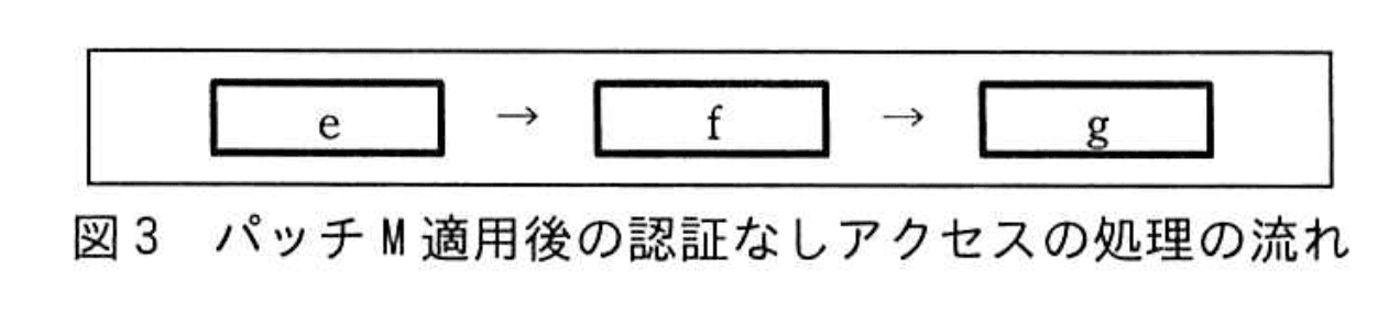 パッチMでは、脆弱性1の対策として、認証なしアクセスの処理の流れにパス名の正規化の処理を加え、さらに、図3に示す順序にした。パス名の正規化とは、相対パスで記述されたパス名を、相対パス記法を含まない形式に変換することである。