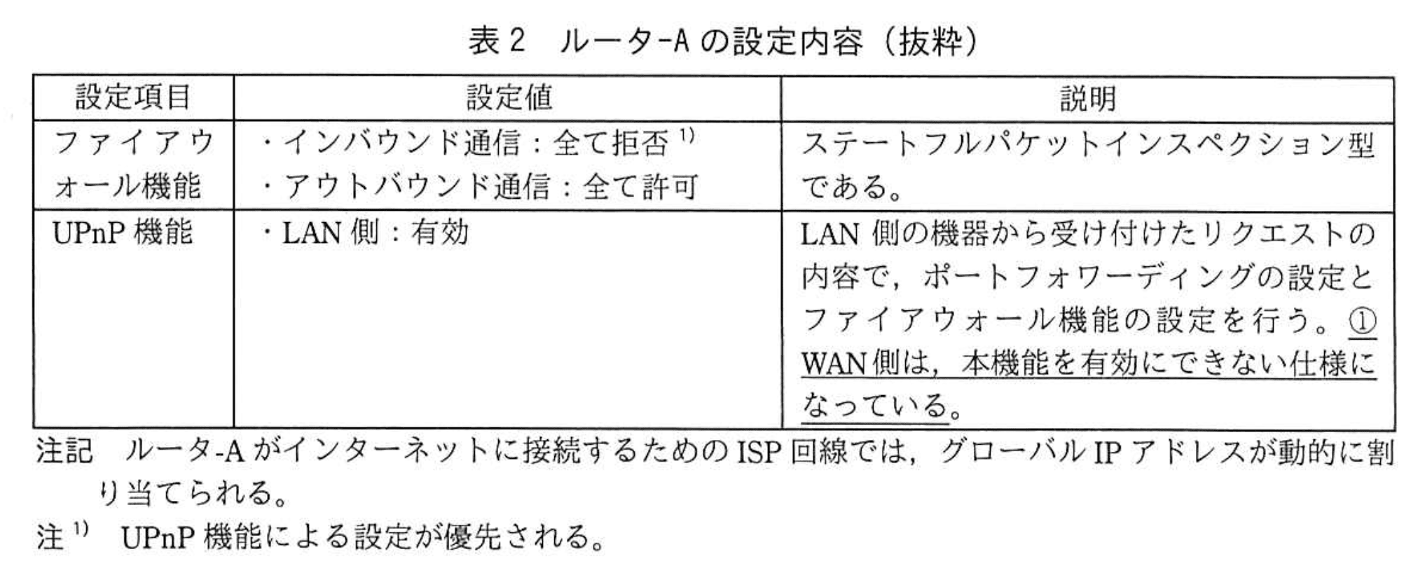 - 【問題文】表2には「UPnP機能 LAN側:有効」とあり、さらに下線①として「WAN側は、本機能を有効にできない仕様になっている」と記載されています。