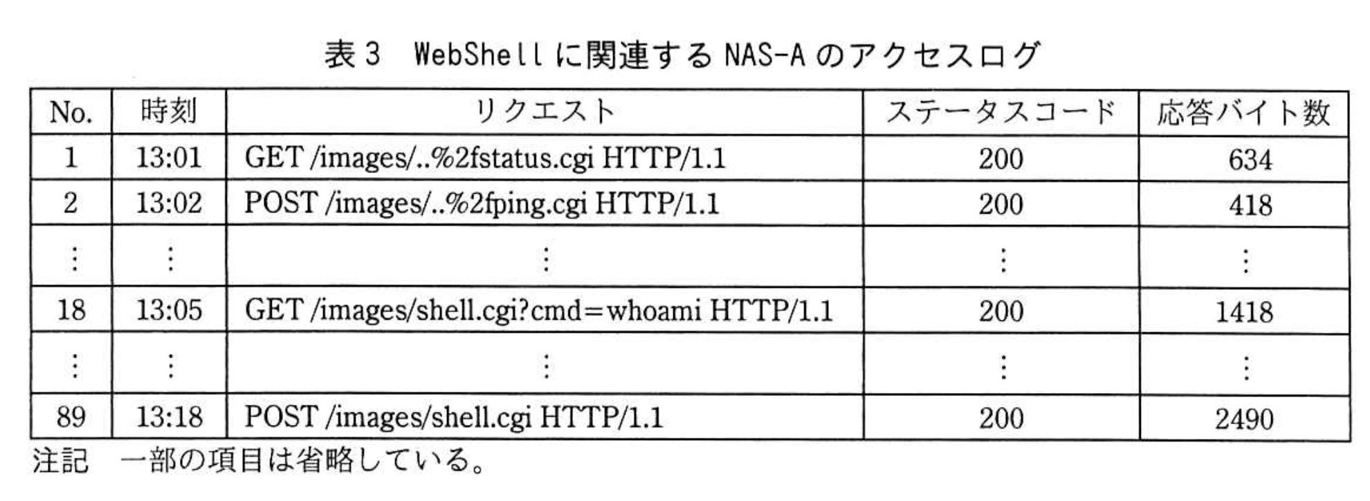 NAS-Aのアクセスログを調査したところ、外部からHTTPSリクエストを使用してOSコマンドを実行する攻撃ツール(以下、WebShellという)がNAS-Aに配置されており、OSコマンドが実行されたことが分かった。NAS-AのアクセスログからWebShellに関連するものを抽出した結果を表3に示す。