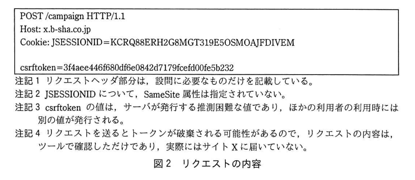 サイトXは、セッションIDをJSESSIONIDというcookieに格納している。D社は、サイトXのキャンペーン応募ページでCSRF脆弱性を検出した。
