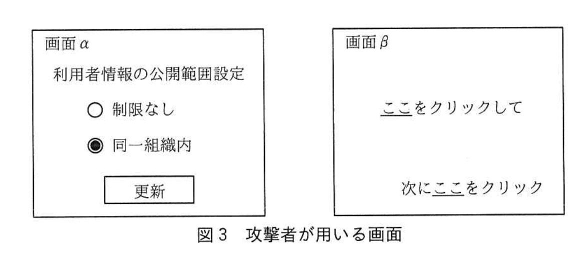サイトXでは、クリックジャッキングによって、利用者が気付かずに利用者情報の公開範囲を変更させられてしまう脆弱性が検出された。攻撃者が図3の画面を用いてクリックジャッキングを行う場合を仮定してみる。このとき、クリックイベントは、利用者から見て手前にある画面上で発生するものとする。