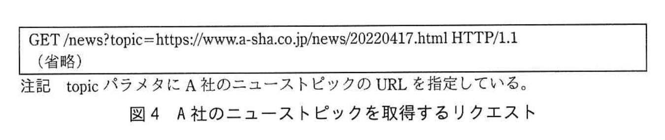 サイトYでは、例えば、図4のリクエストを受け取ると、A社のニューストピックを取得し、表示するようになっている。