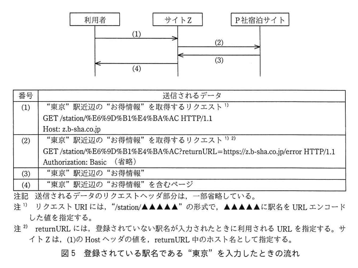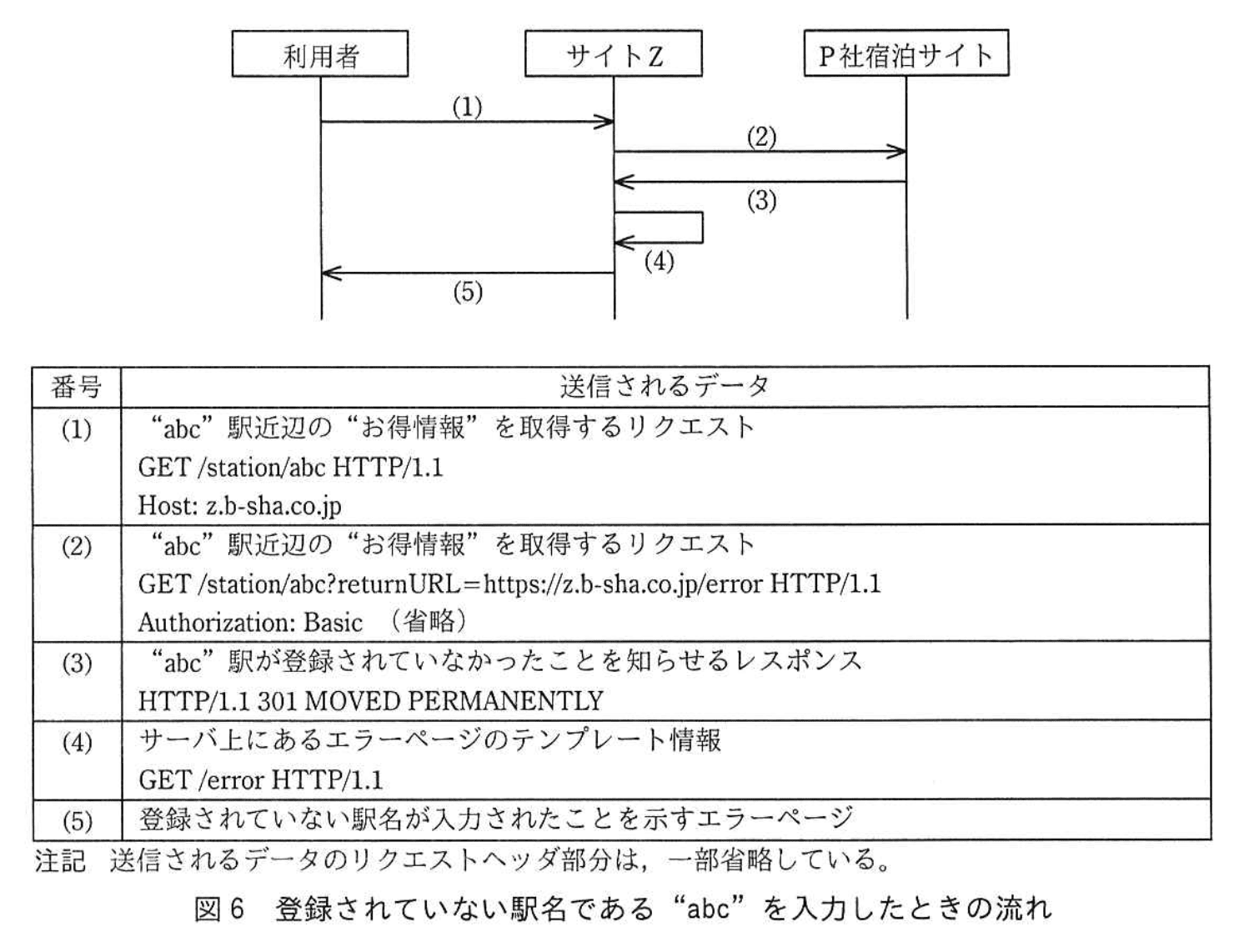 サイトZでは、最近、新機能が開発された。新機能の一つである、旅行会社 P 社の宿泊サイト(以下、P 社宿泊サイトという)との連携機能でSSRF脆弱性が検出された。その機能は、駅名を入力すると、その駅近辺のホテルの割引クーポンなどの“お得情報”を表示できるというものである。利用者が、P 社宿泊サイトに登録されている駅名の一つ、“東京”を入力したときの流れを図5に、登録されていない架空の駅名である“abc”を入力したときの流れを図6に、D社の専門技術者 V氏がSSRF脆弱性を検出した手順を表4に示す。