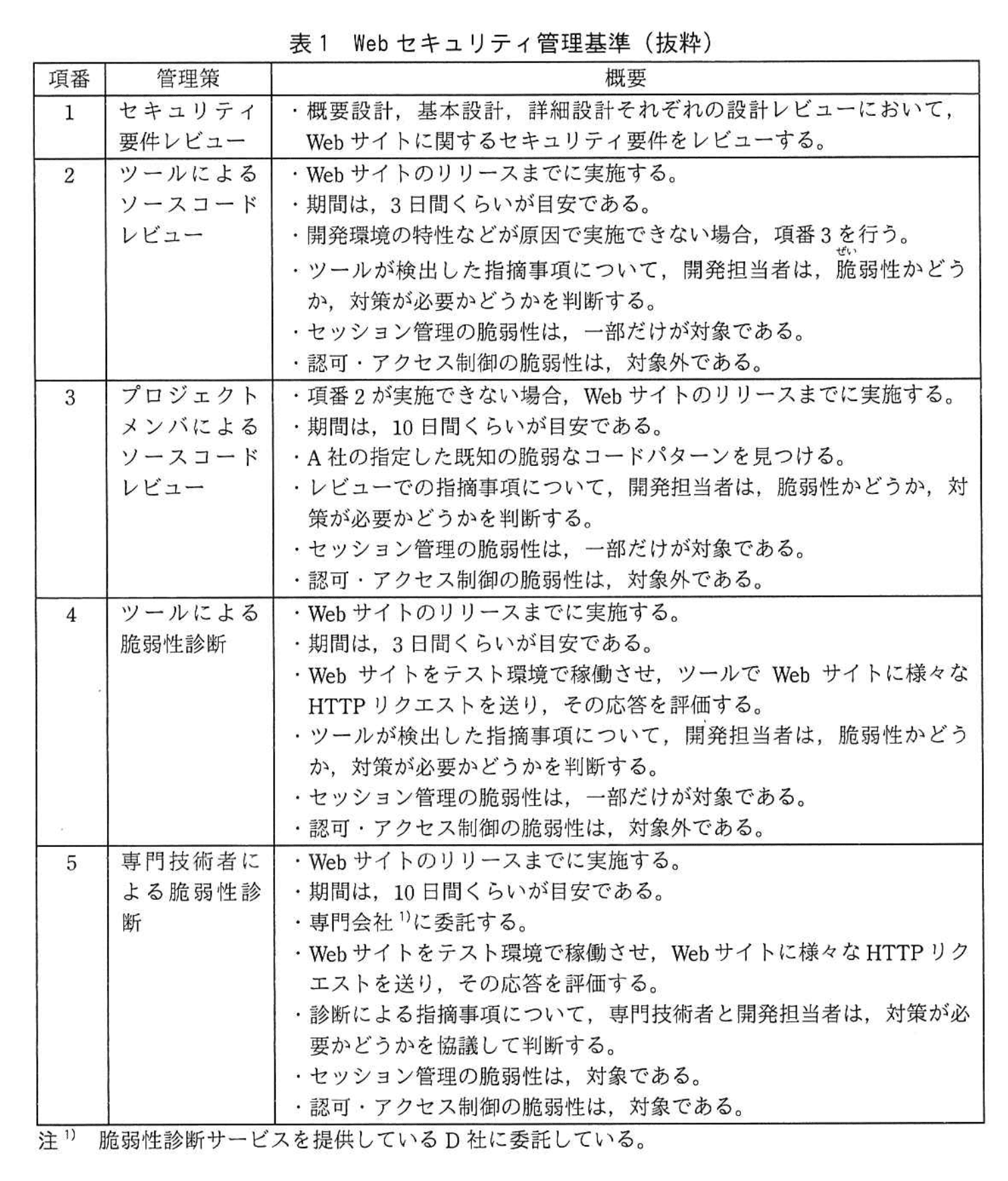 A社は、従業員1,500名の中堅システム開発会社である。A社では、セキュリティ品質の高いWebサイトを開発するために、表1に示すWebセキュリティ管理基準を定めて運用している。