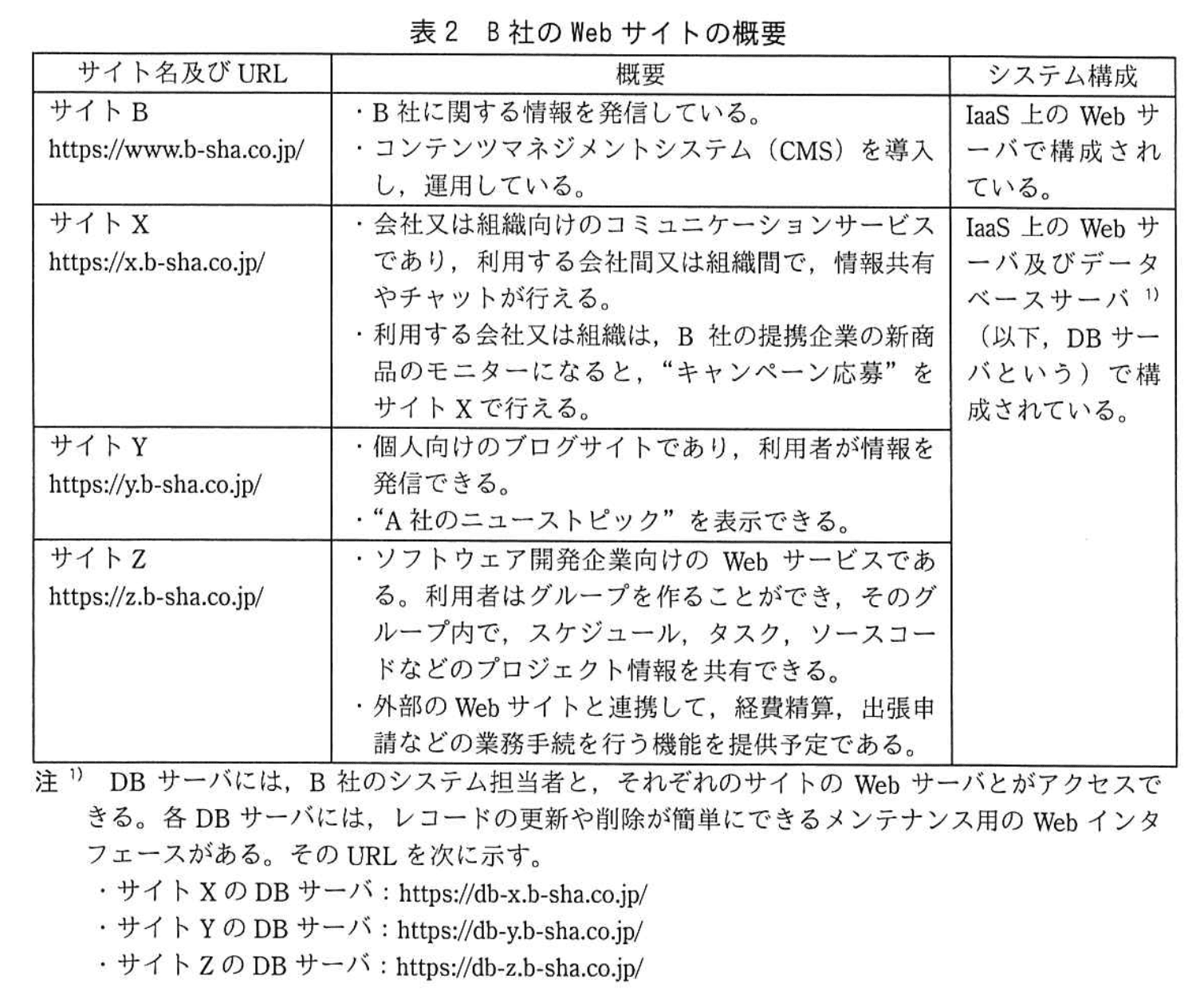 B社のクラウド環境には、コーポレートサイト(以下、サイトBという)、及びB社が提供中の三つのSaaSそれぞれのWebサイト(以下、サイトX、サイトY、サイトZという)がある。それらの概要を表2に示す。
