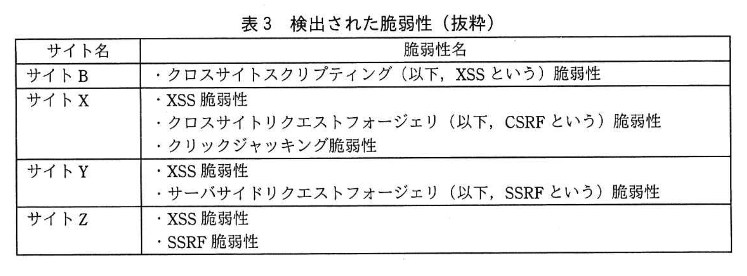 Rさんは、サイトB、サイトX、サイトY及びサイトZに対する脆弱性診断をD社に依頼した。診断の結果、検出された脆弱性を表3に示す。