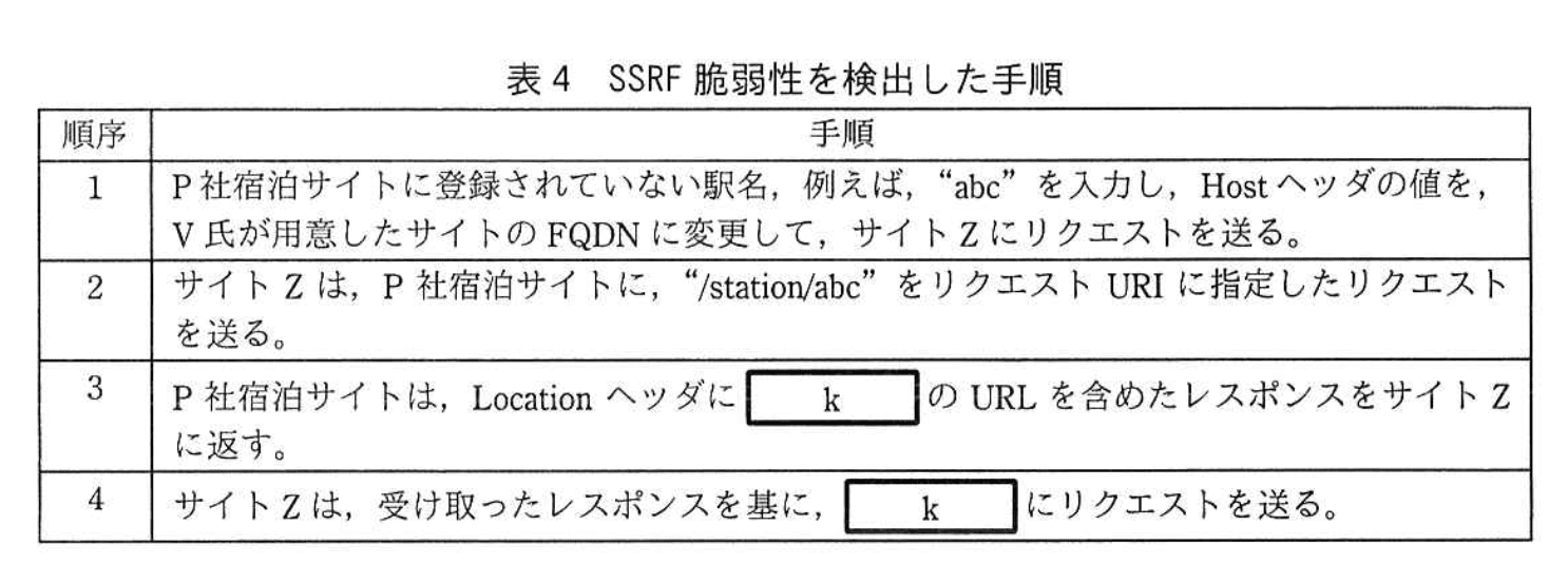 D社からは、P社宿泊サイトからのレスポンスに含まれるURLが想定されたものかを調べて想定外の値の場合はそのURLにはアクセスしないようにするという、SSRF脆弱性への対策が提案された。加えて、④別の対策も実施することが望ましいとのことであった。