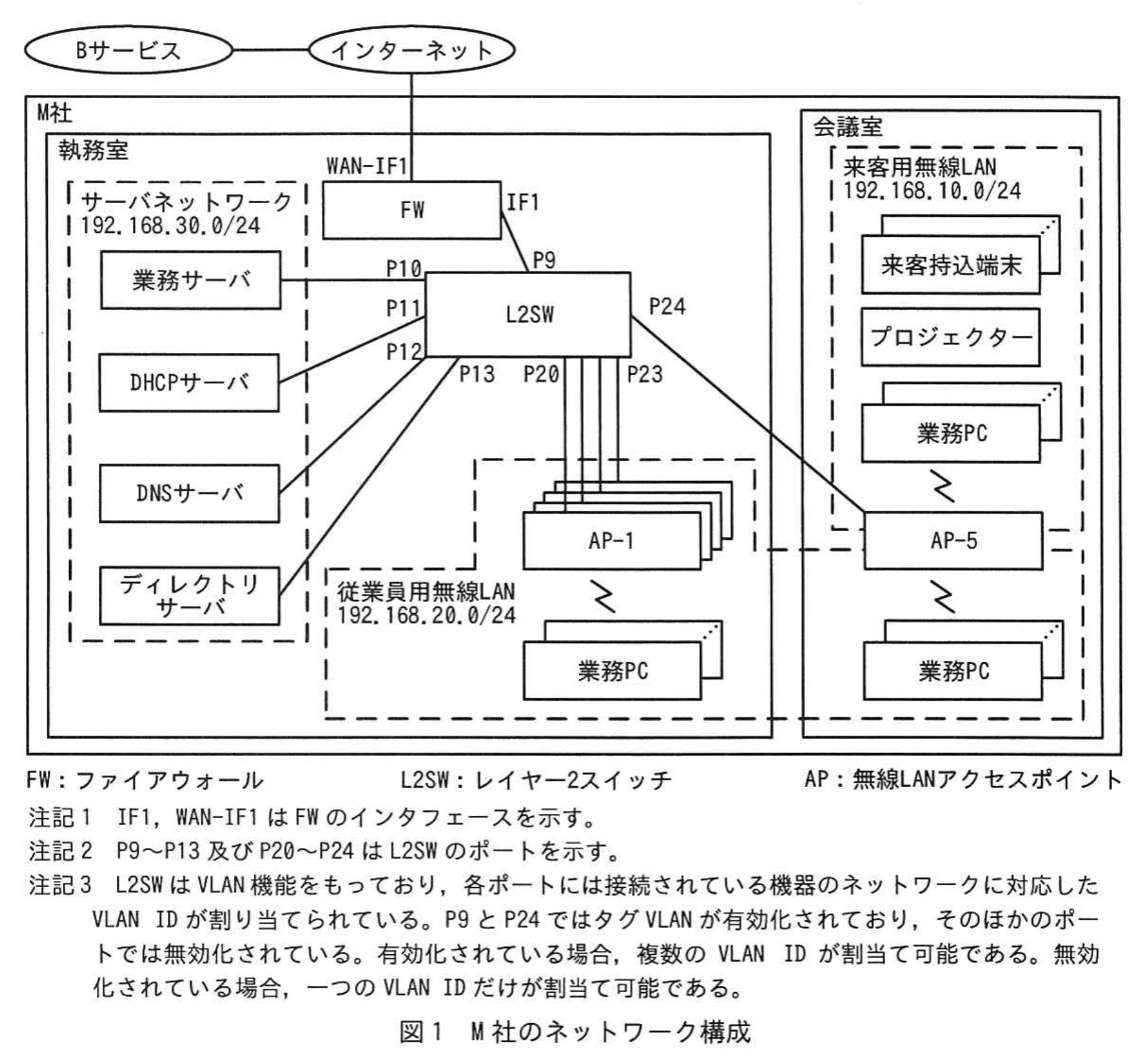 M社のオフィスビルには、執務室と会議室がある。執務室では従業員用無線LANが利用可能であり、会議室では、従業員用無線LANと来客用無線LANの両方が利用可能である。会議室にはプロジェクターが設置されており、来客が持ち込むPG、タブレット及びスマートフォン(以下、これらを併せて来客持込端末という)又は業務PCを来客用無線LANに接続することで利用可能である。
