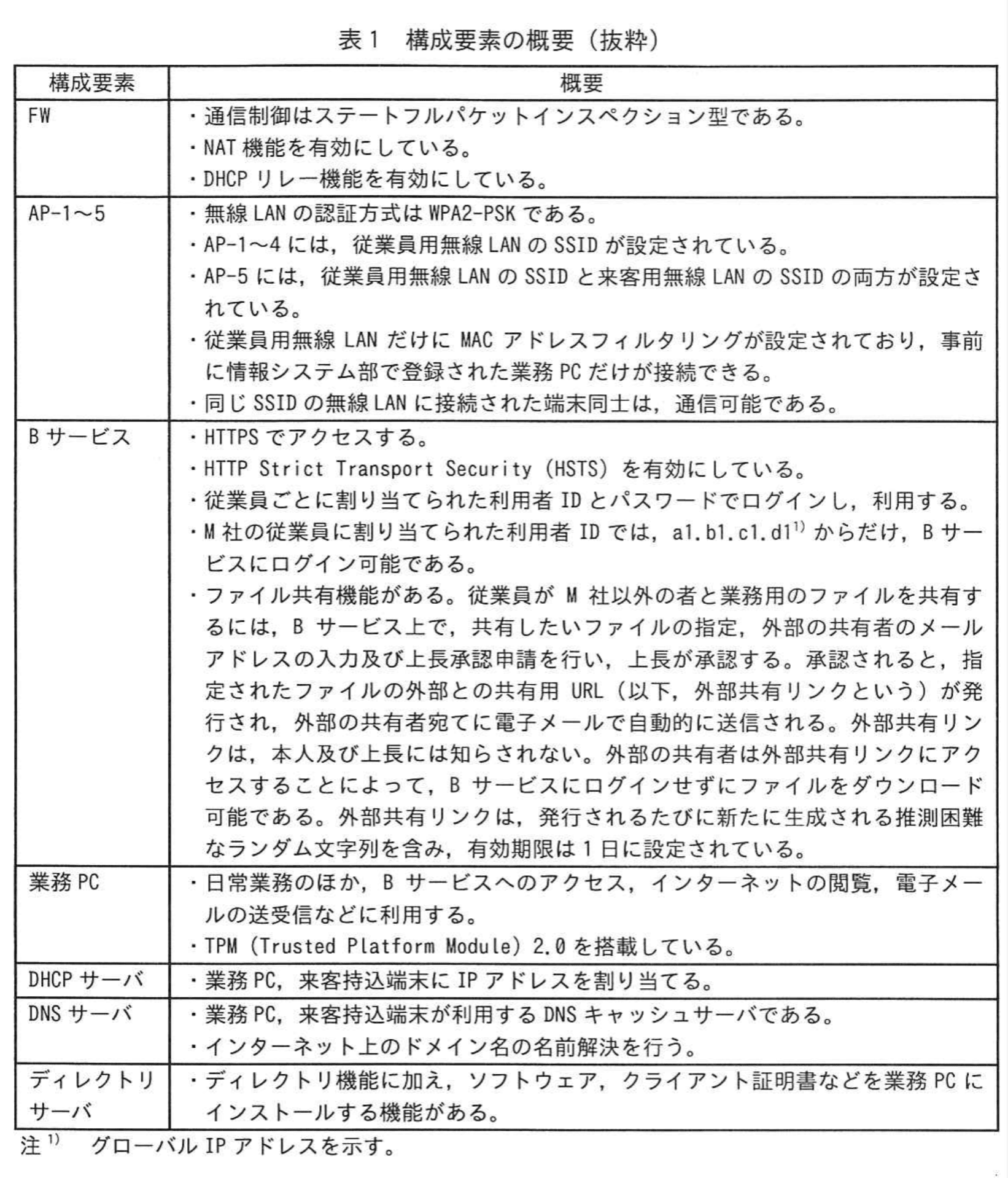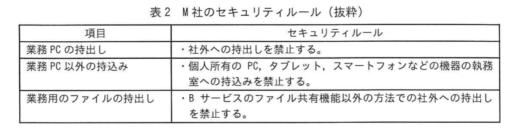 - さらに「M社の従業員に割り当てられた利用者IDでは、a1.b1.c1.d1 からだけ、Bサービスにログイン可能である。」とも記載されています。