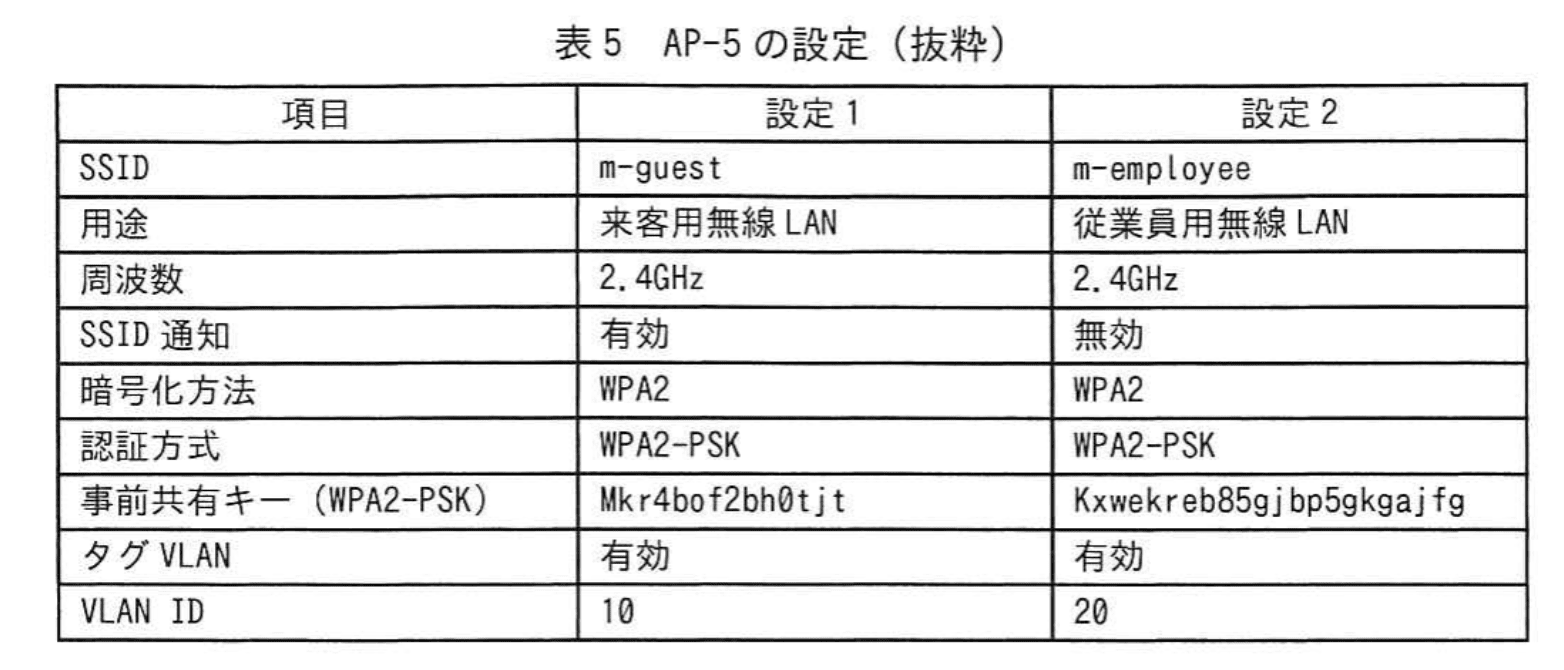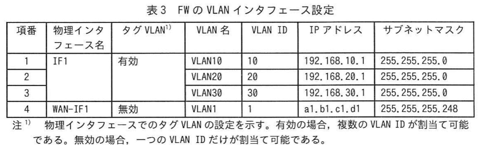 FWのVLANインタフェース設定を表3に、FWのフィルタリング設定を表4に、AP-5の設定を表5に示す。
