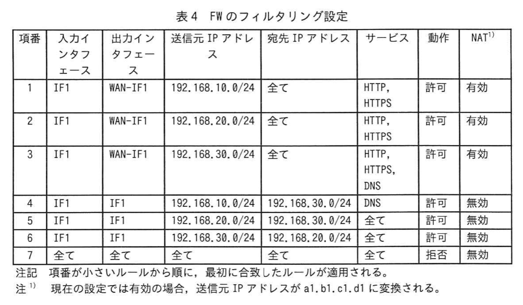 - 表4 の「項番 1」は送信元「192.168.10.0/24」を Internet に出すルール、 「項番 4」は送信元「192.168.10.0/24」を DNS サーバ(192.168.30.0/24)に通すルールです。