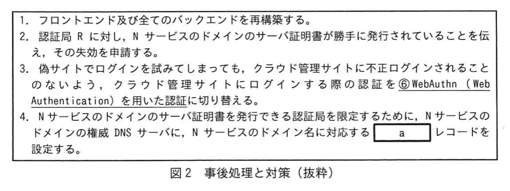 “4. N サービスのドメインのサーバ証明書を発行できる認証局を限定するために、N サービスのドメインの権威 DNS サーバに、N サービスのドメイン名に対応するaレコードを設定する。” - DNS で「どの認証局が当該ドメインに証明書を発行してよいか」を宣言する仕組みは Certificate Authority Authorization(CAA)レコードです。CAA レコードを設定すると、認証局は証明書発行前に DNS を確認し、許可されていない場合は発行を拒否します。