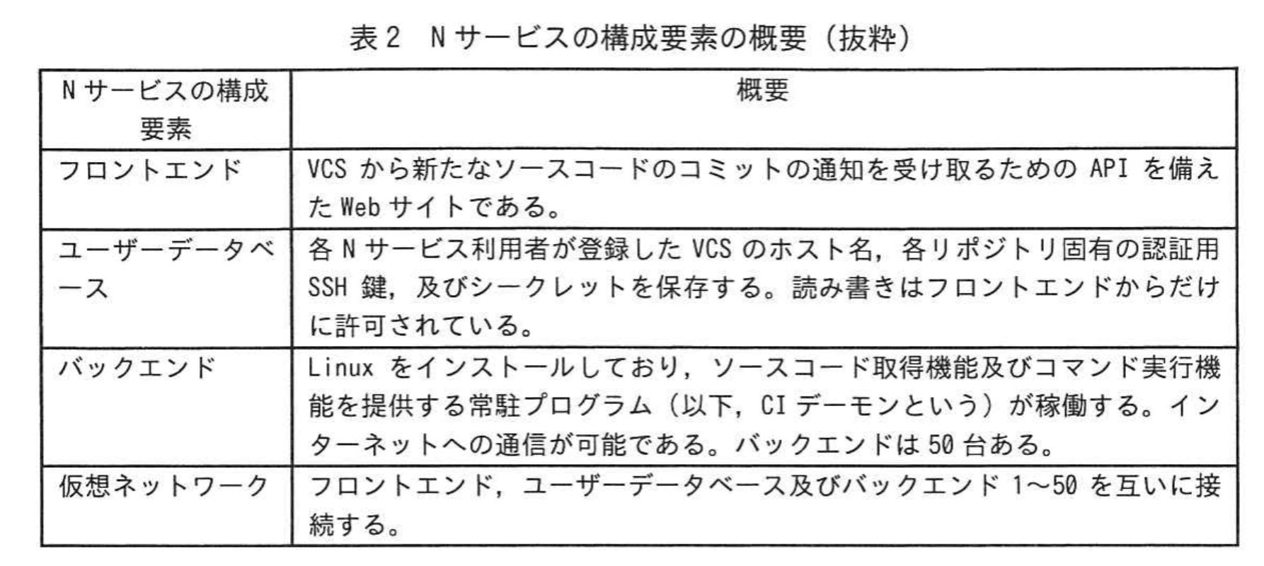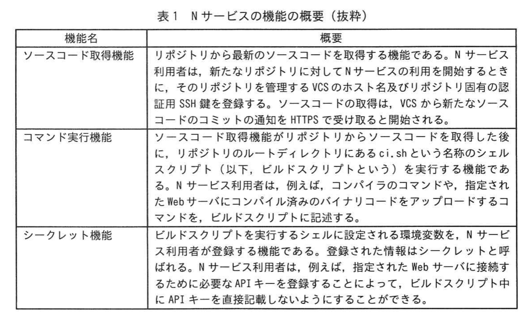 N社は、Nサービスという継続的インテグレーションサービスを提供している従業員400名の事業者である。Nサービスの利用者(以下、Nサービス利用者という)は、バージョン管理システム(以下、VCSという)にコミットしたソースコードを自動的にコンパイルするなどの目的で、Nサービスを利用する。VCSでは、リポジトリという単位でソースコードを管理する。Nサービスの機能の概要を表1に示す
