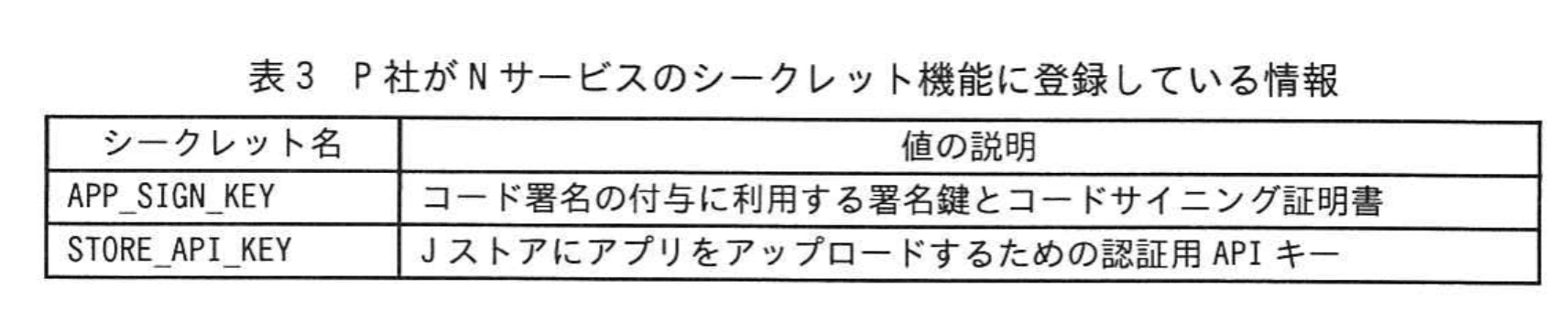 - P社がシークレットとして登録していたのは「APP_SIGN_KEY」と「STORE_API_KEY」(表3)。