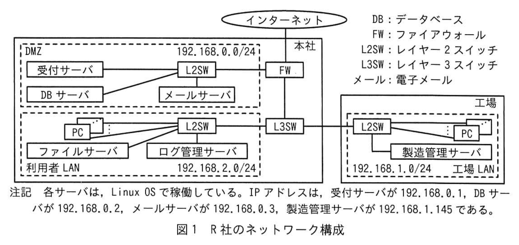 R社は、精密機器の部品を製造する従業員250名の中堅の製造業者である。本社に隣接した場所に工場がある。R社のネットワーク構成を図1に示す。