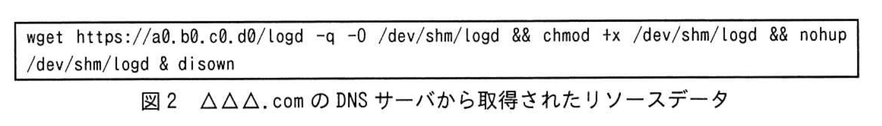 Mさんは、攻撃者が受付サーバで何か設定変更していないかを調査した。確認したところ、③機器の起動時にDNSリクエストを発行して、ドメイン名△△△.comのDNSサーバからTXTレコードのリソースデータを取得し、リソースデータの内容をそのままコマンドとして実行するcronエントリーが仕掛けられていた。Mさんが調査のためにdigコマンドを実行すると、図2に示すようなリソースデータが取得された。