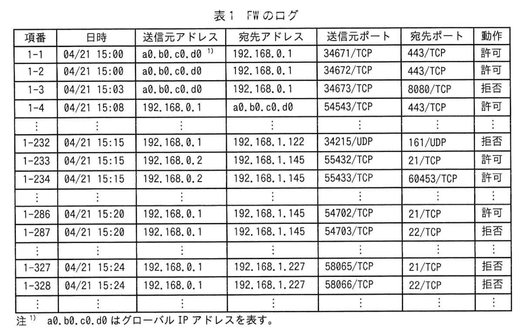 ログイン失敗が発生した時間帯のFWのログを表1に示す。