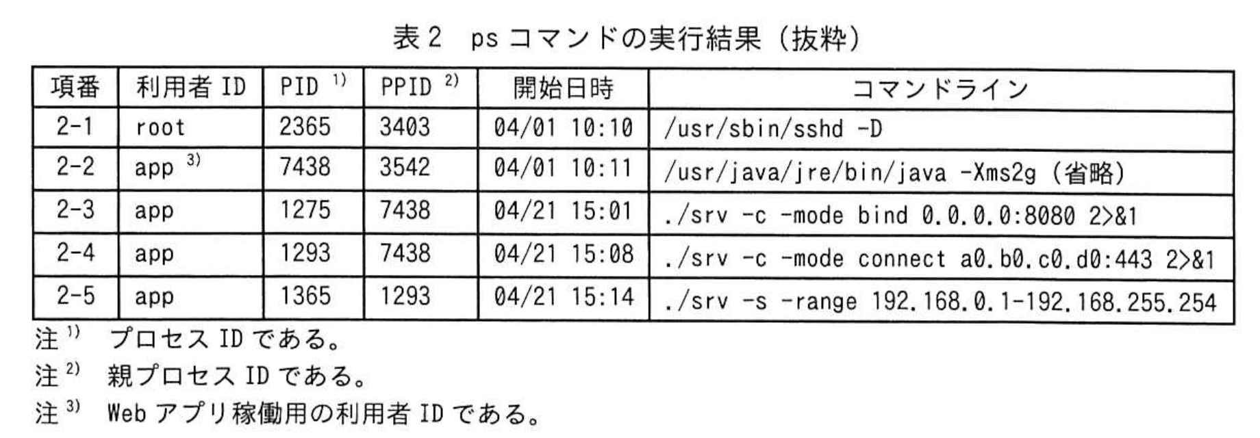 Mさんは、受付サーバでプロセスとネットワーク接続を調査した。psコマンドの実行結果を表2に、netstatコマンドの実行結果を表3に示す。