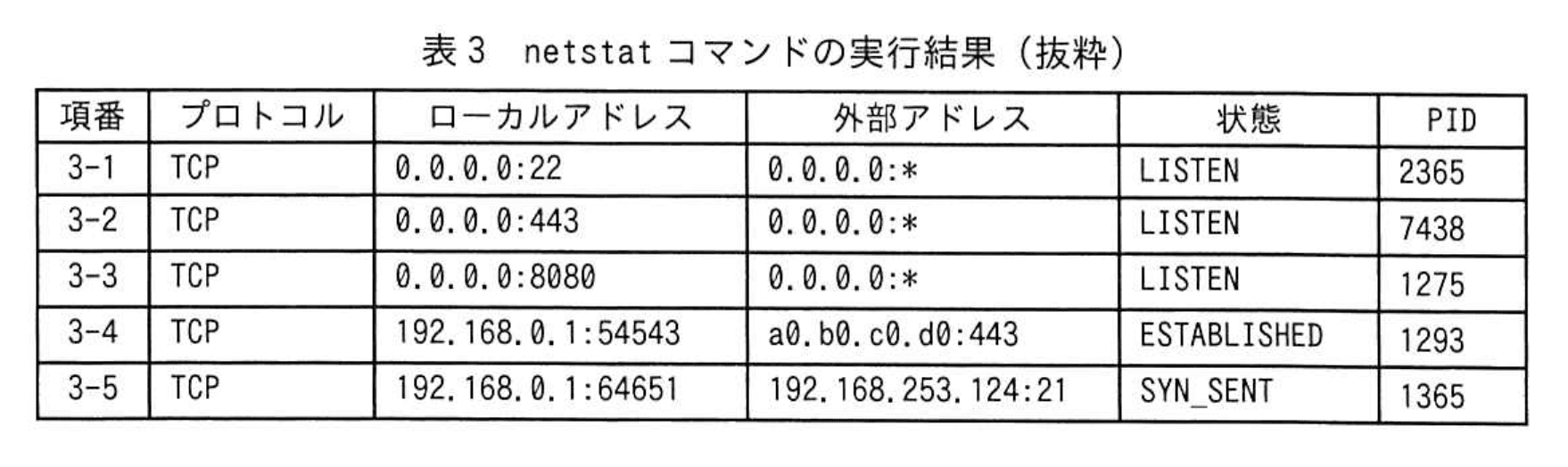 - netstat の「SYN_SENT」行(3-5)はスキャンの一部ですが PID を直接示さないため、ここだけを根拠にすると誤答になりがちです。
