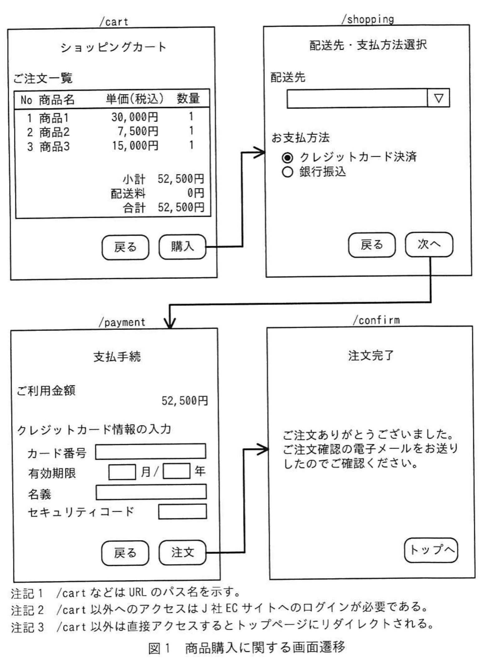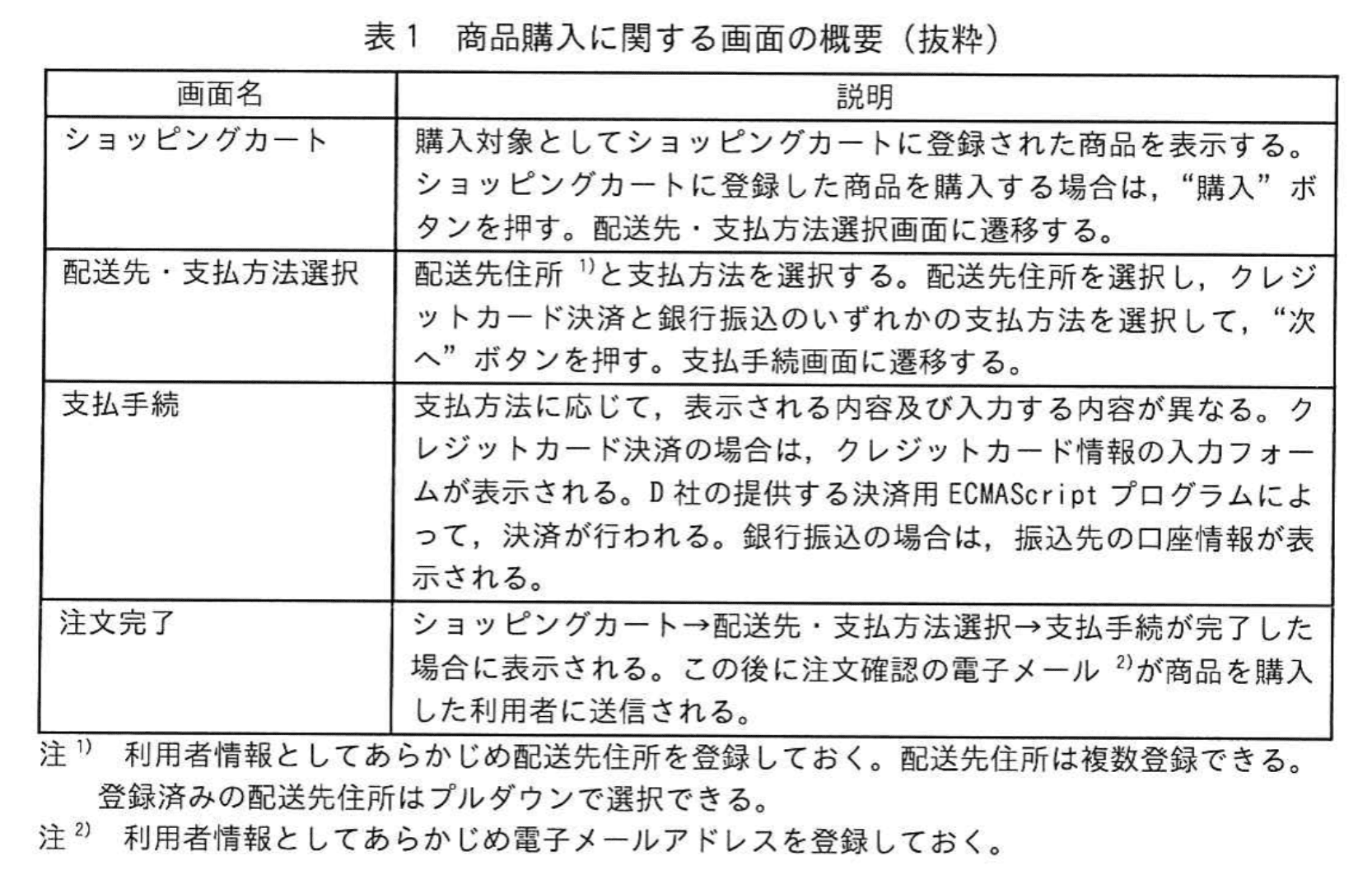 クレジットカード決済はD社の決済代行サービスを利用している。D社の提供する決済用ECMAScriptプログラムを使用したトークン型決済を用いて、クレジットカード情報の非保持化を実現している。商品購入に関する画面の概要を表1に、画面遷移を図1に示す。