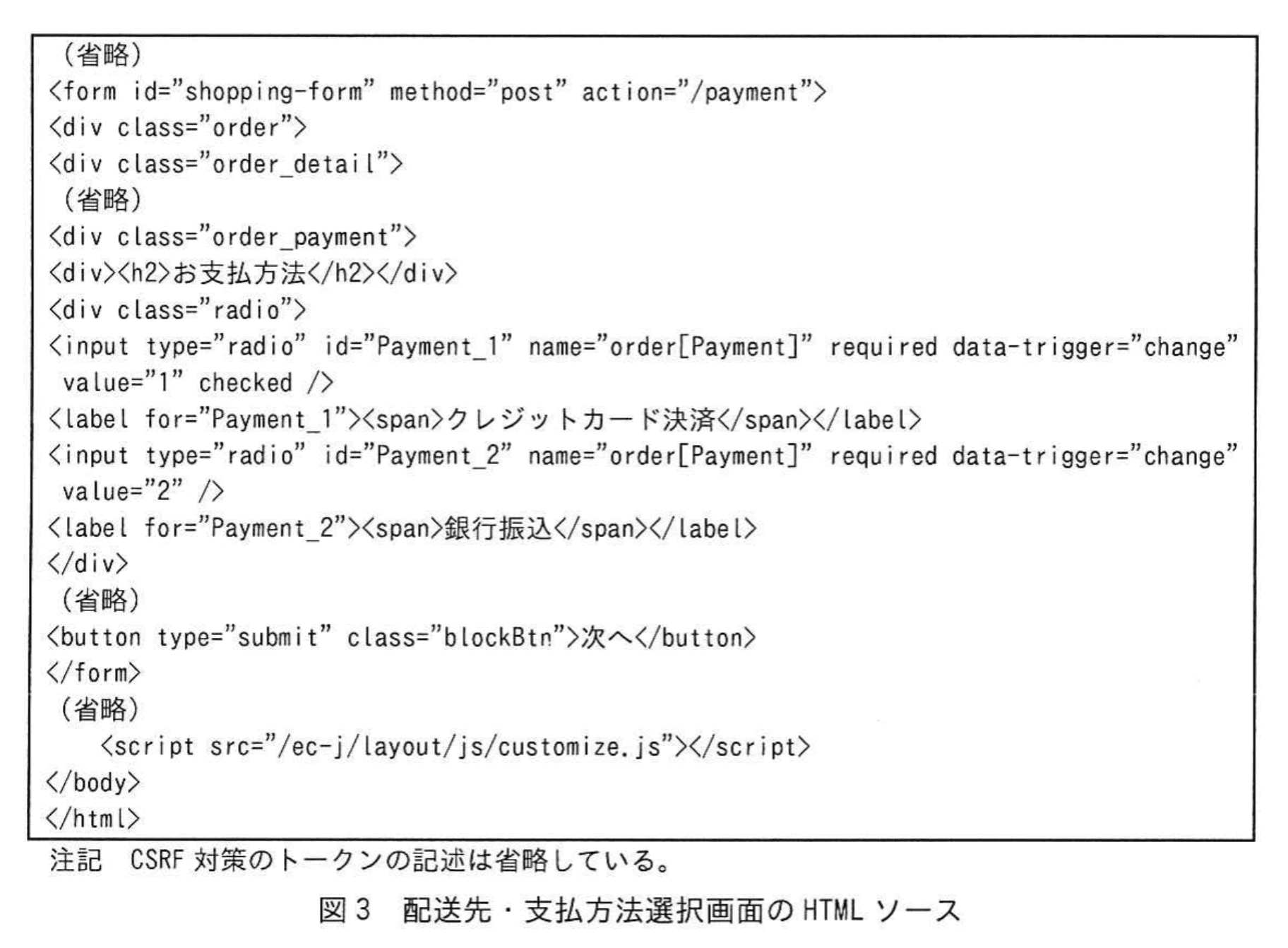 6月14日にV社から連絡があり、PUTメソッドによるファイル更新はV社によるものではなかったことが判明した。Webサーバに設置していたECMAScriptファイルの一つcustomize.jsが攻撃者のファイル(以下、ファイルKという)に置き換えられていた。customize.jsは、通常時は空のファイルであり、Webサイトのデザインを一時的に変更する際に利用するものである。①配送先・支払方法選択画面でファイルKが読み込まれており、HTMLの一部が書き換えられていた。この書換えによって、②配送先・支払方法選択画面から支払手続画面への画面遷移の処理で利用しているパラメータの値が変更され、支払方法がクレジットカード決済に固定されていた。ファイルKを整形したものを図2に、配送先・支払方法選択画面のHTMLソースを図3に示す。