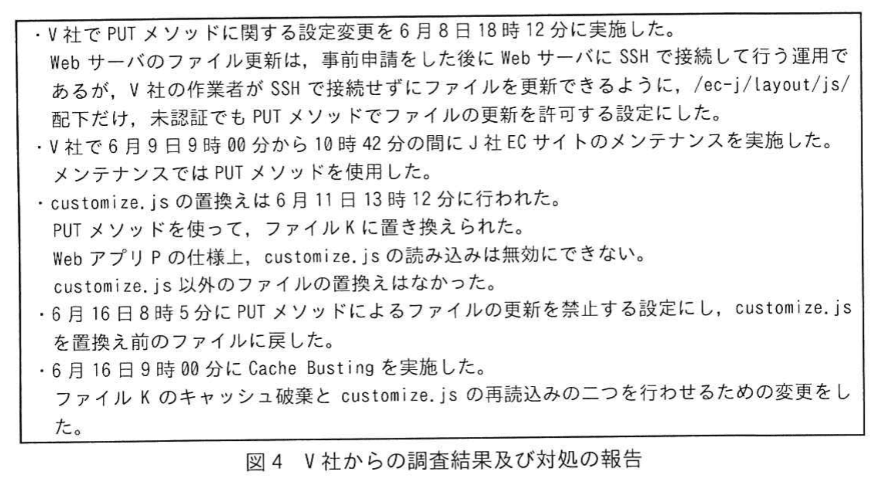 その後、6月16日にV社から、customize.jsの置換えについての調査結果及び対処の報告があった。その報告を図4に示す。