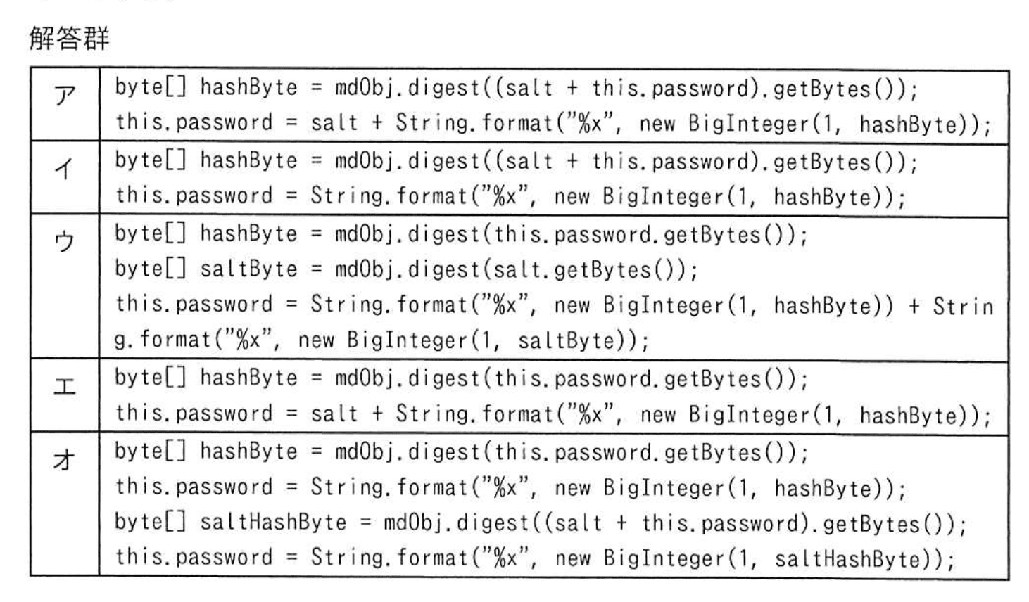 - 設問の前提は「変数saltには、addUserメソッドの呼出しごとに異なる32バイトの固定長文字列が入っている」。したがって