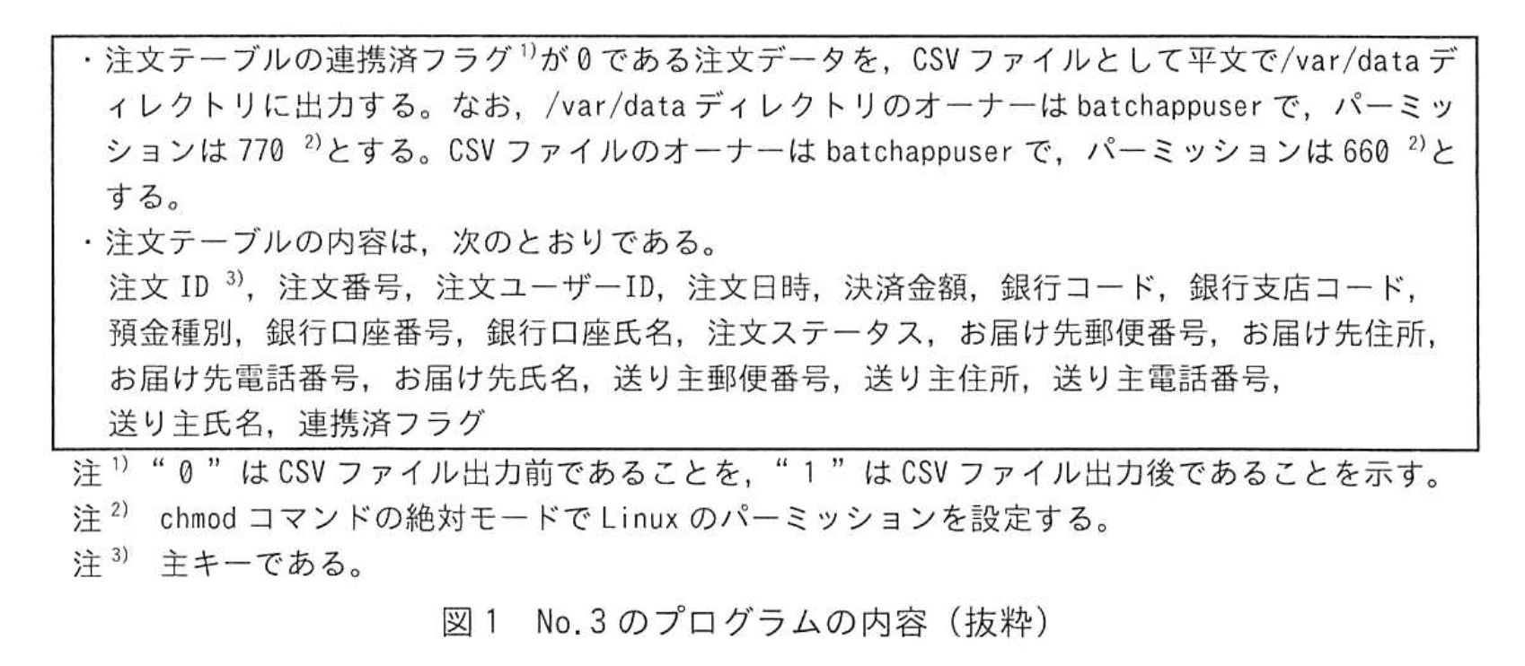 【問題文】図1では「/var/dataディレクトリのオーナーはbatchappuserで、パーミッションは770」「CSVファイルのオーナーはbatchappuserで、パーミッションは660」と定義されています。