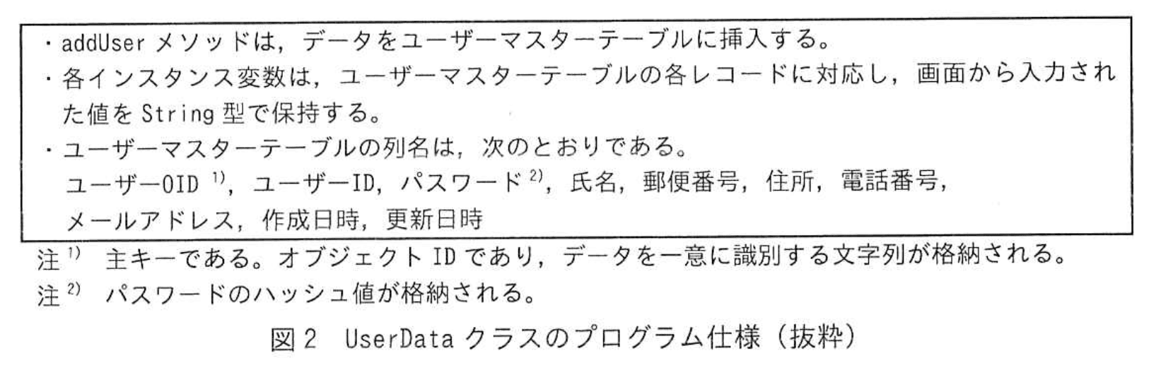 ユーザー登録機能は、UserDataクラスによって実現している。UserDataクラスのプログラム仕様を図2に、UserDataクラスのソースコードを図3に示す。